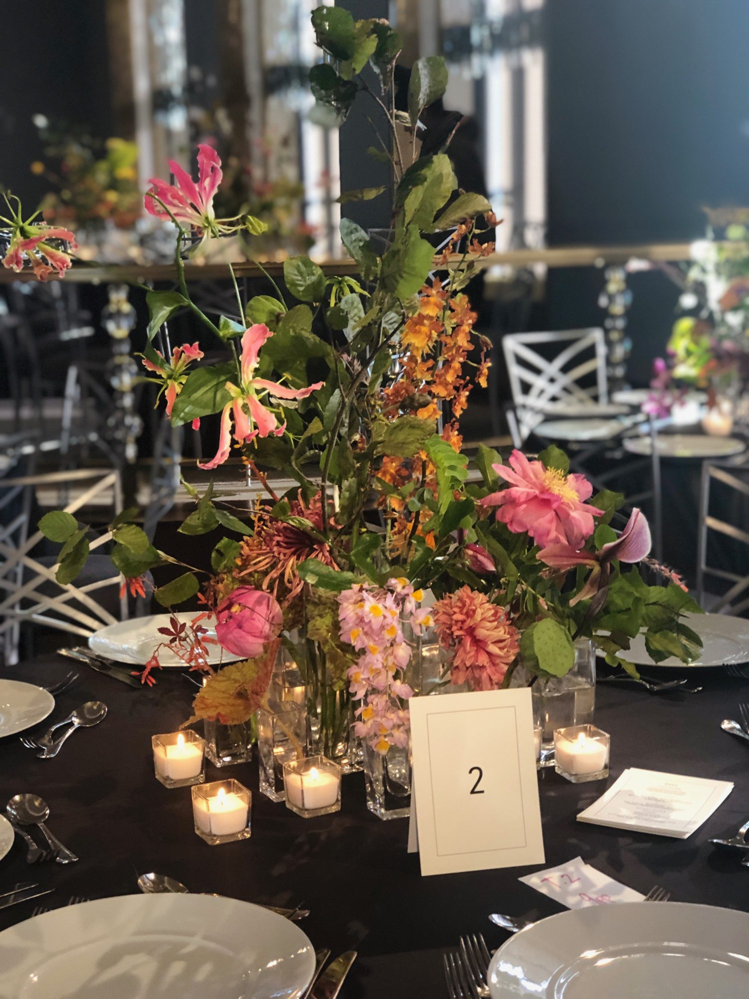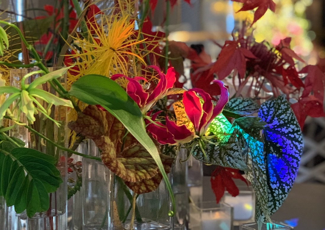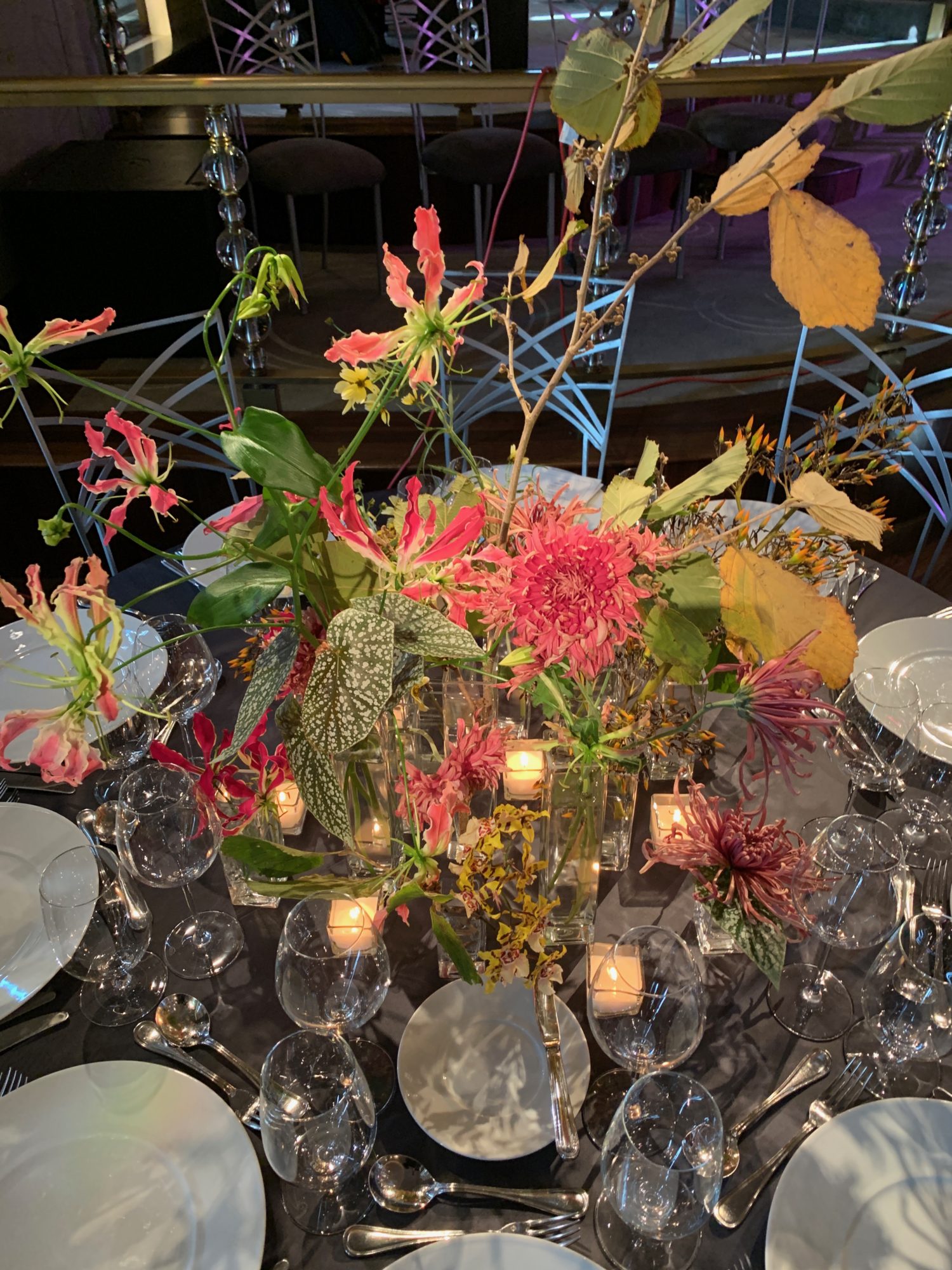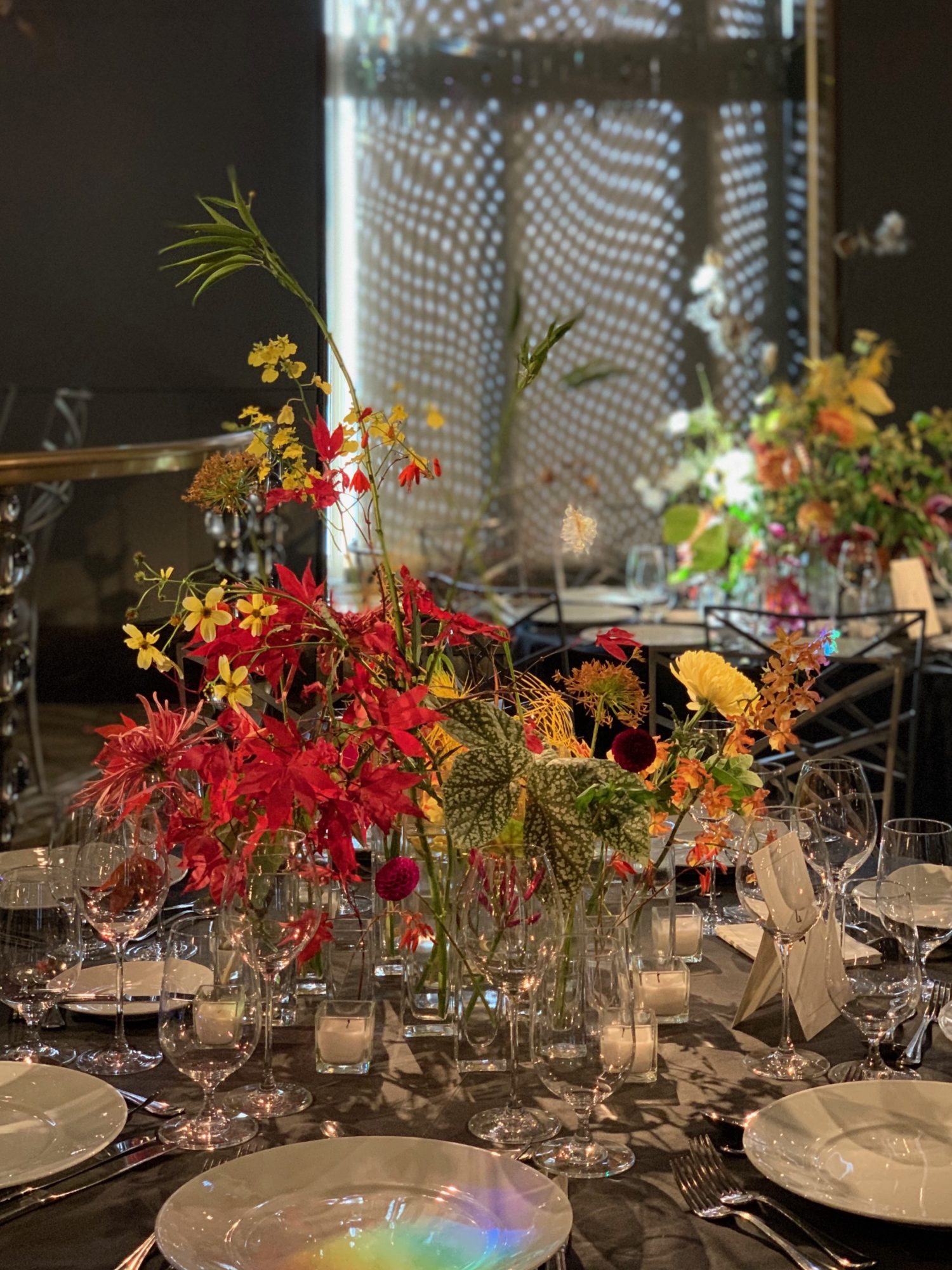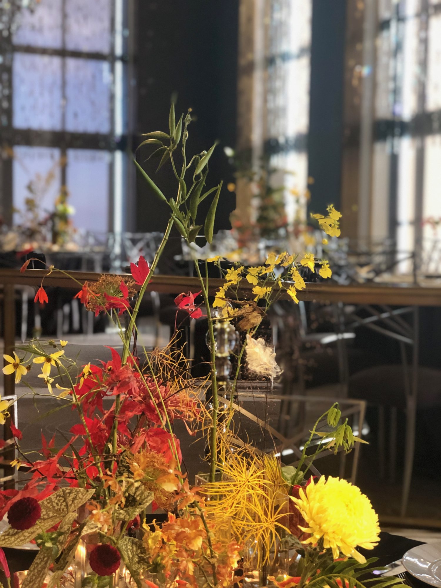 This unconventional bride chose a most iconic of New York locations for her October celebration: The Rainbow Room.  Taking a cue from the room’s play of orbital and rectilinear forms (rotating dance floor/rectangular prisms hanging in the grand windows), our tabletop design was composed of tiny glass cityscapes filled with a botanist’s array of specimens.  These delicate compositions seemed all the more intricate against our monumental ceremony installation and massive domes of Japanese maple and Liquidamber.  The season was writ large against the New York City skyline.