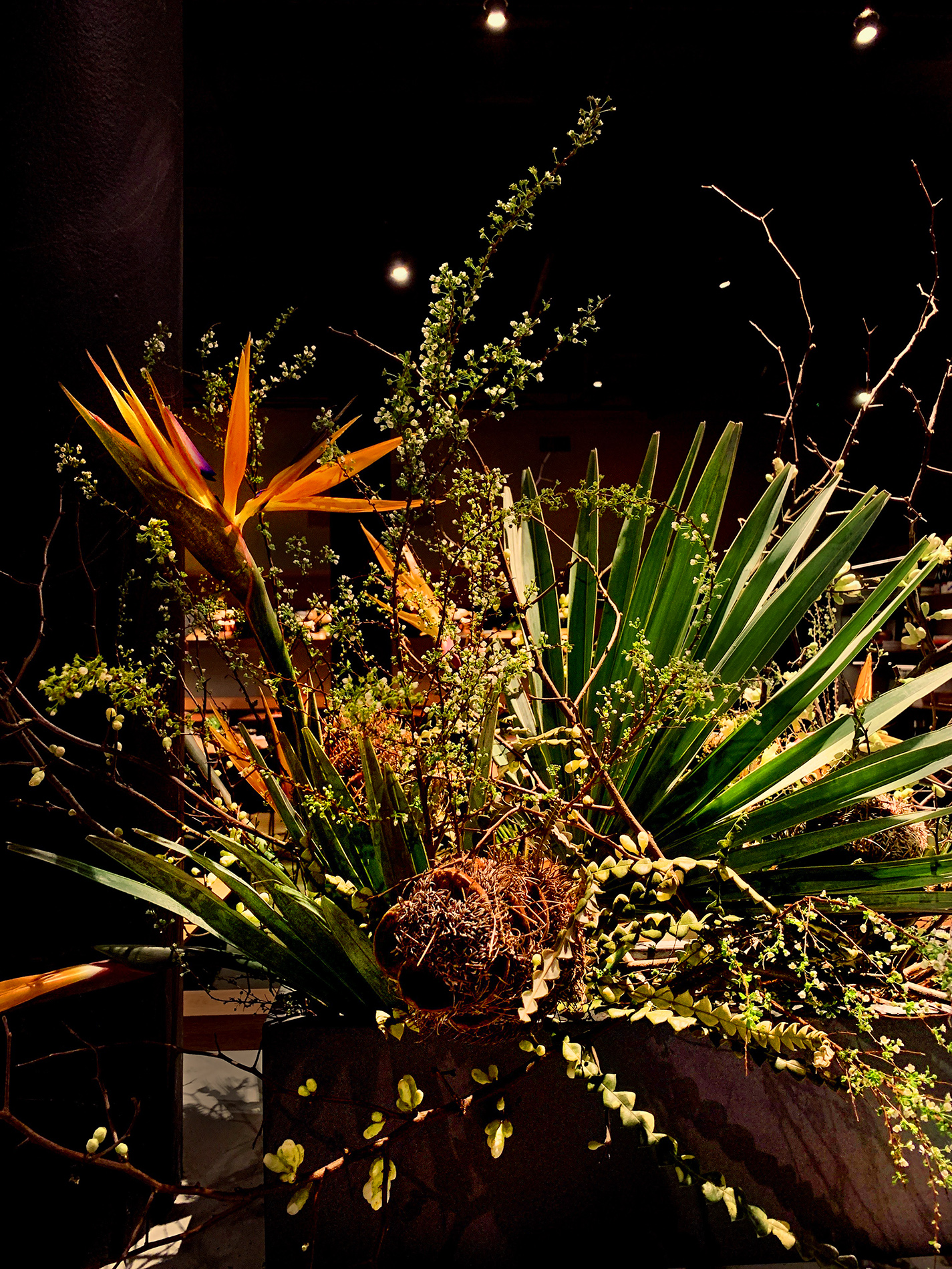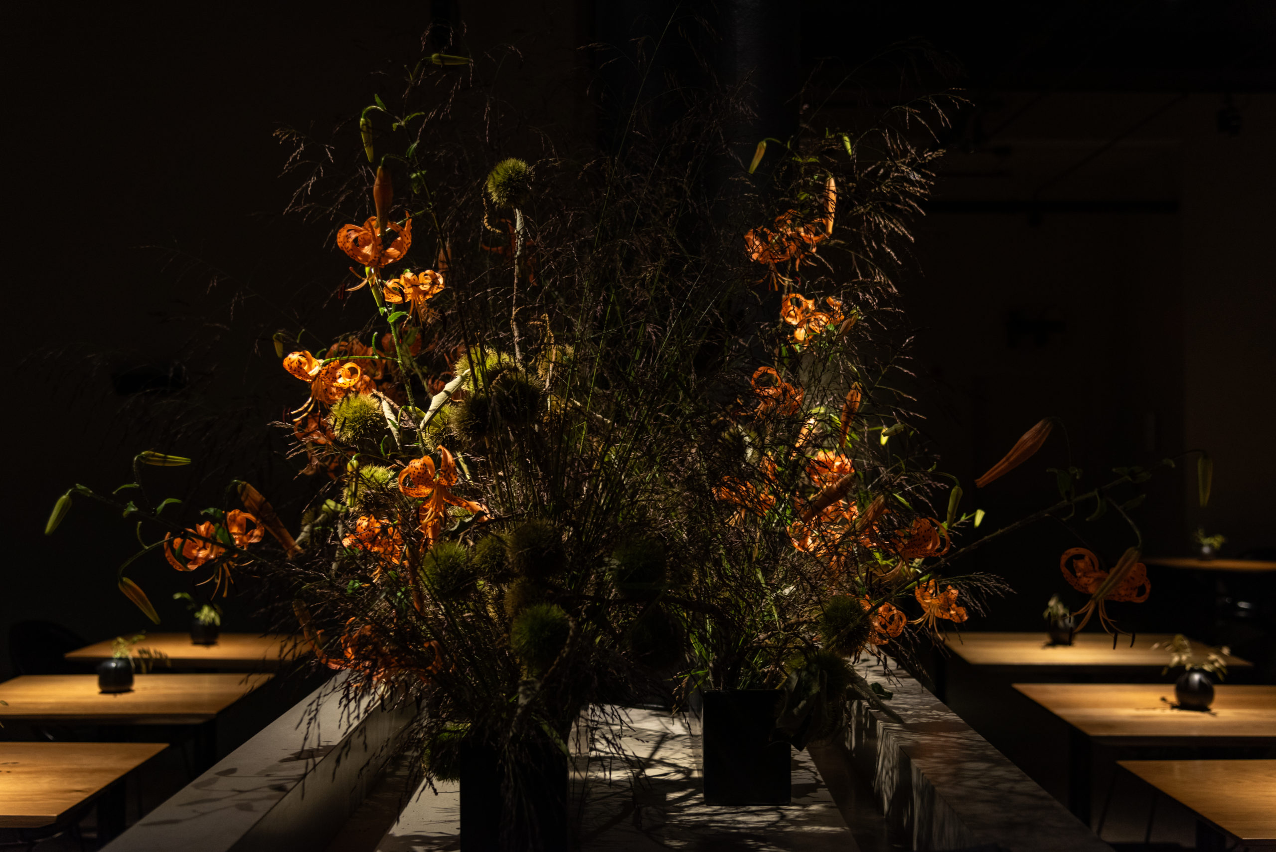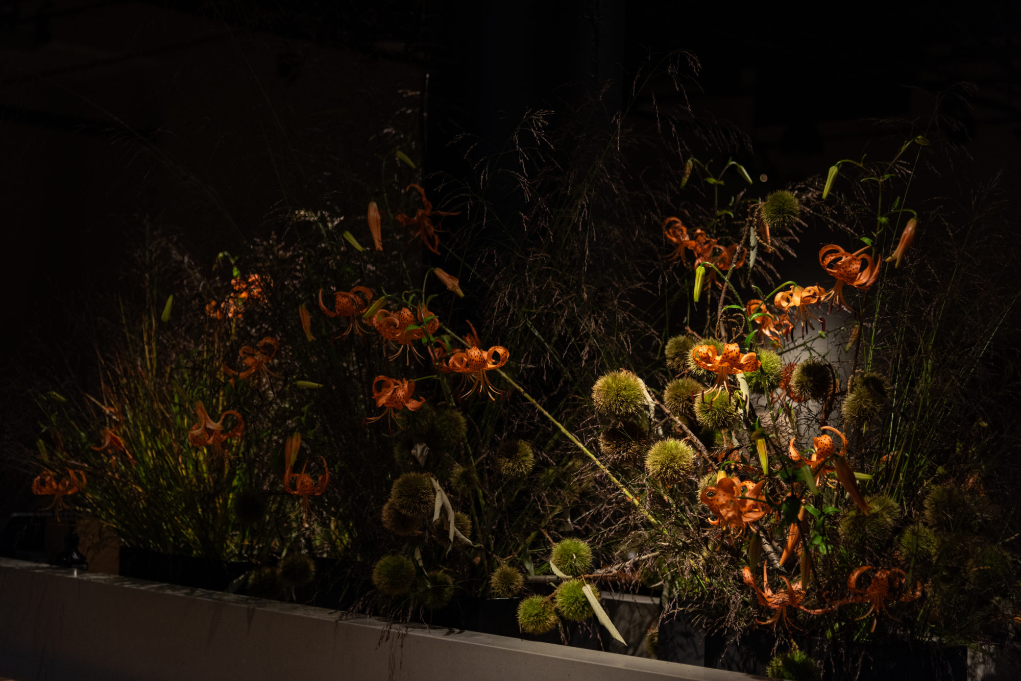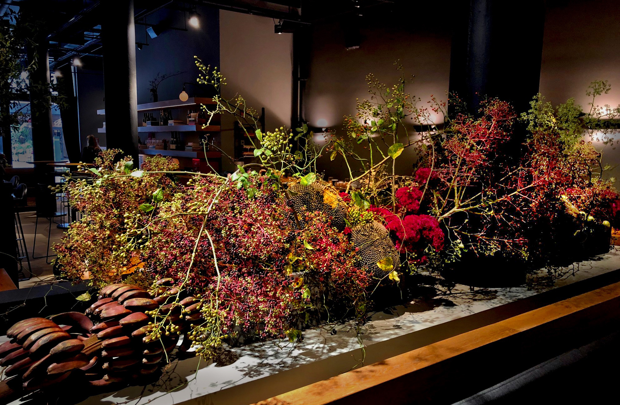 For Cosme, Enrique Olvera’s acclaimed New York restaurant, we marry the flora of the banks of the Hudson with those of different parts of the Mexican landscape. We invite the furry beast Heliconia “She-Kong” to drink at the trough with any number of Northern orchard branches, and weave palms through a thicket of Greenbriar.