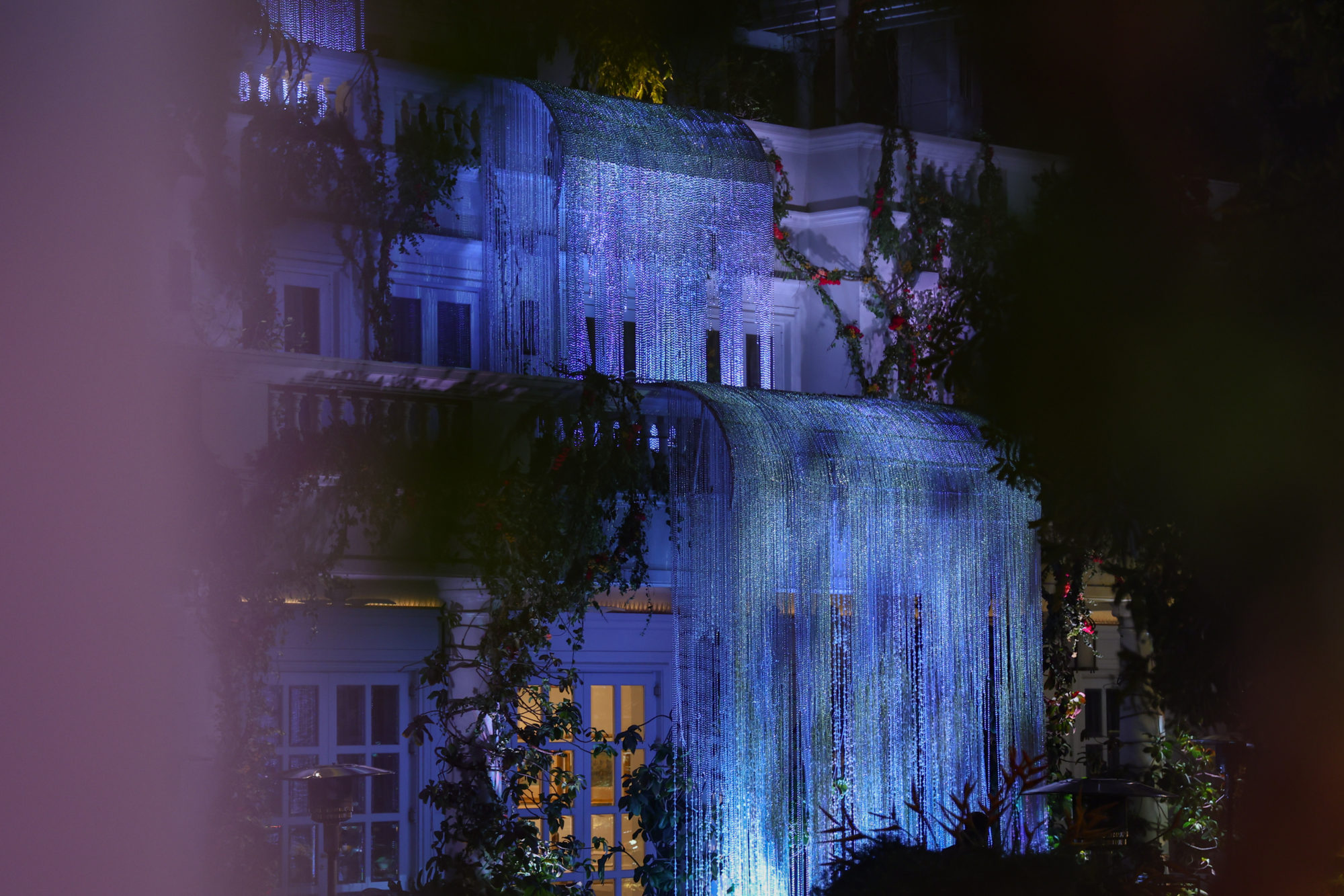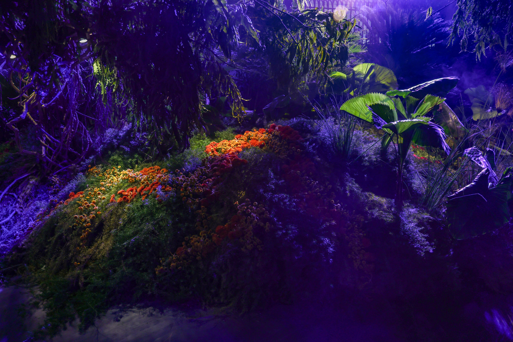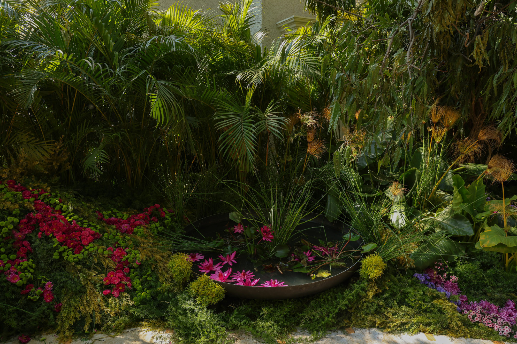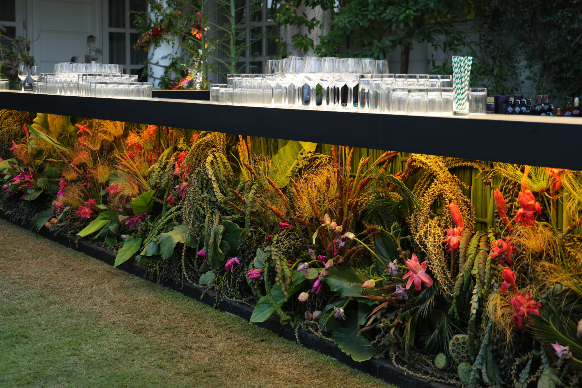 Much to my amazement, I was asked to visit India to imagine designs for a February celebration. I had long dreamed of visiting the subcontinent, and this adventure proved to be astonishing on every level. We created immersive designs for this private garden, transforming the existing façades, trees, lawns and driveways into forests, waterfalls and fantasy landscapes. We used 99% Indian grown plants and flowers, discovering our botanical muses in the local treetops, following the seasons through the fall, learning more and knowing less than ever.