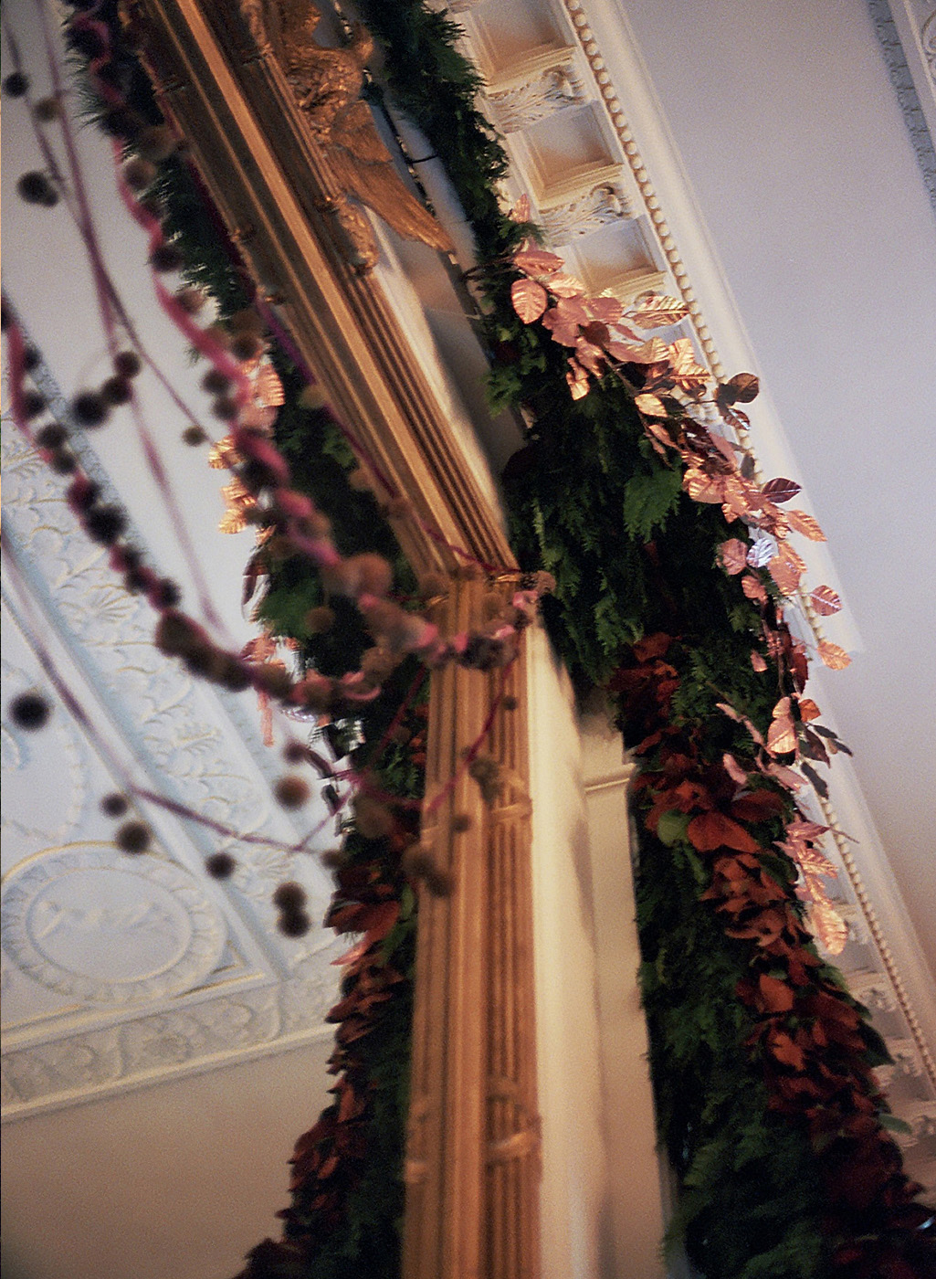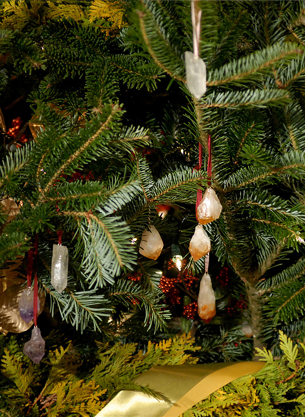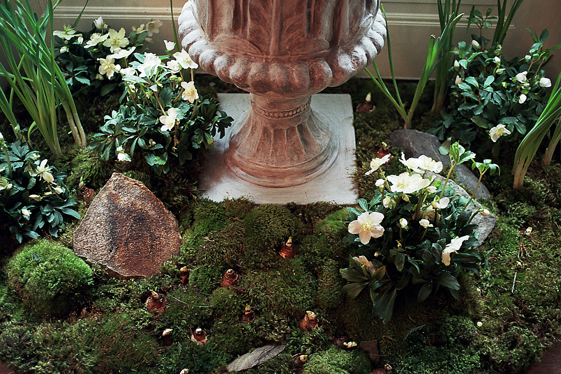 Emily was invited to be guest designer for Holidays at The White House, bringing a natural grandeur to the East Room (the ballroom), and the Palm Room, a passageway between East and West Wings. With the help of many volunteers, Emily and her team constructed sculptural garlands and intimate gardens, designing with rocks from her childhood home in Northern Vermont. Trees were dressed with evergreen garlands and raw quartz ornaments, stone mantles with stones, mirrors were hung with velvet ribbons strung with sweetgum and sycamore pods, and the gardens sprouted paperwhites and blooming hellebores over the course of the season, for a subtly lavish and deeply authentic design celebrating the natural world and the timeless nature of the House. Photography by Josie Miner.