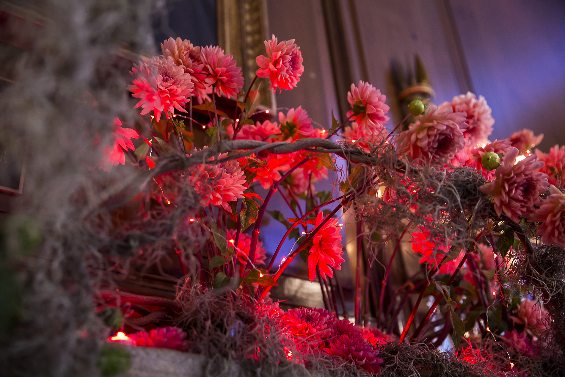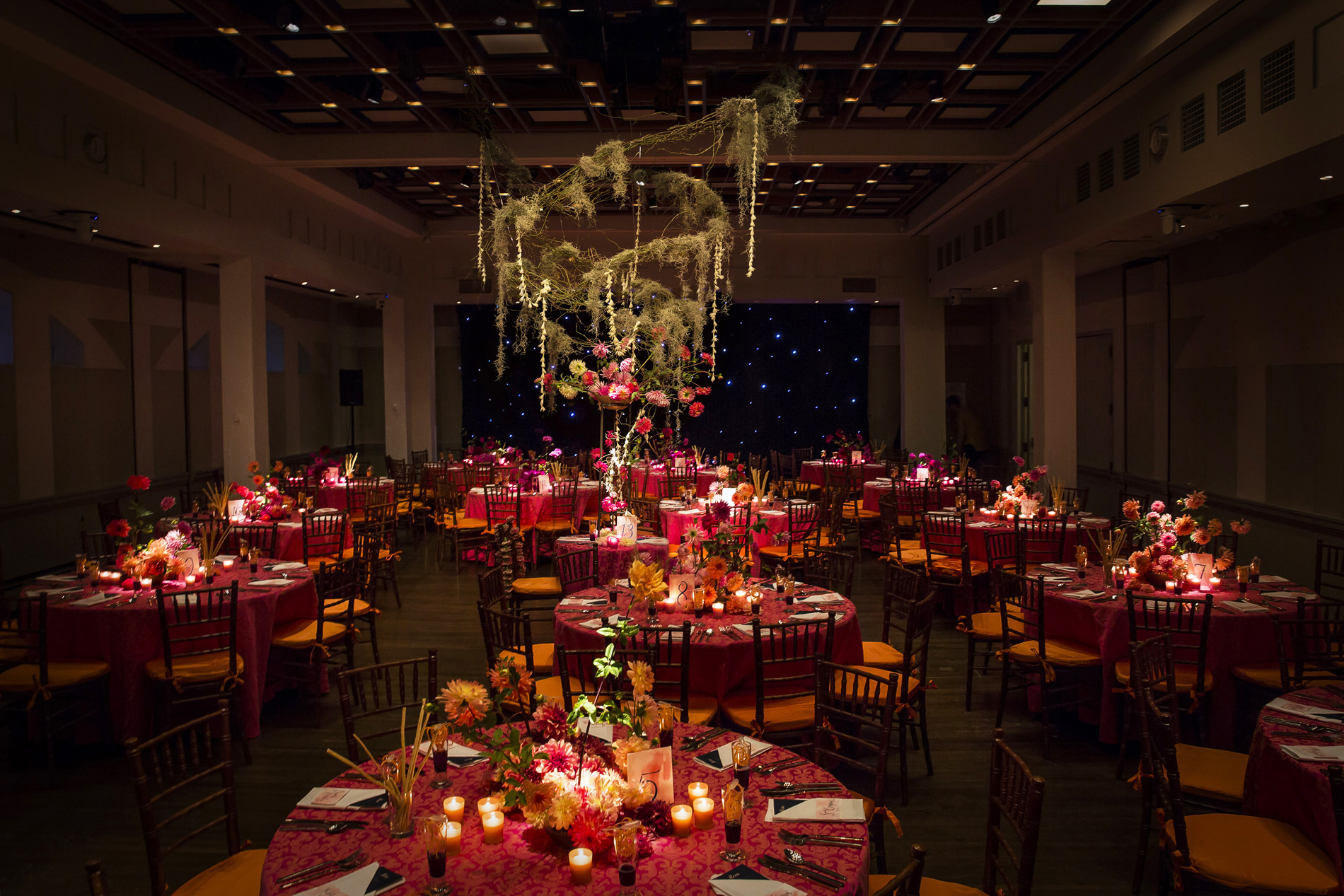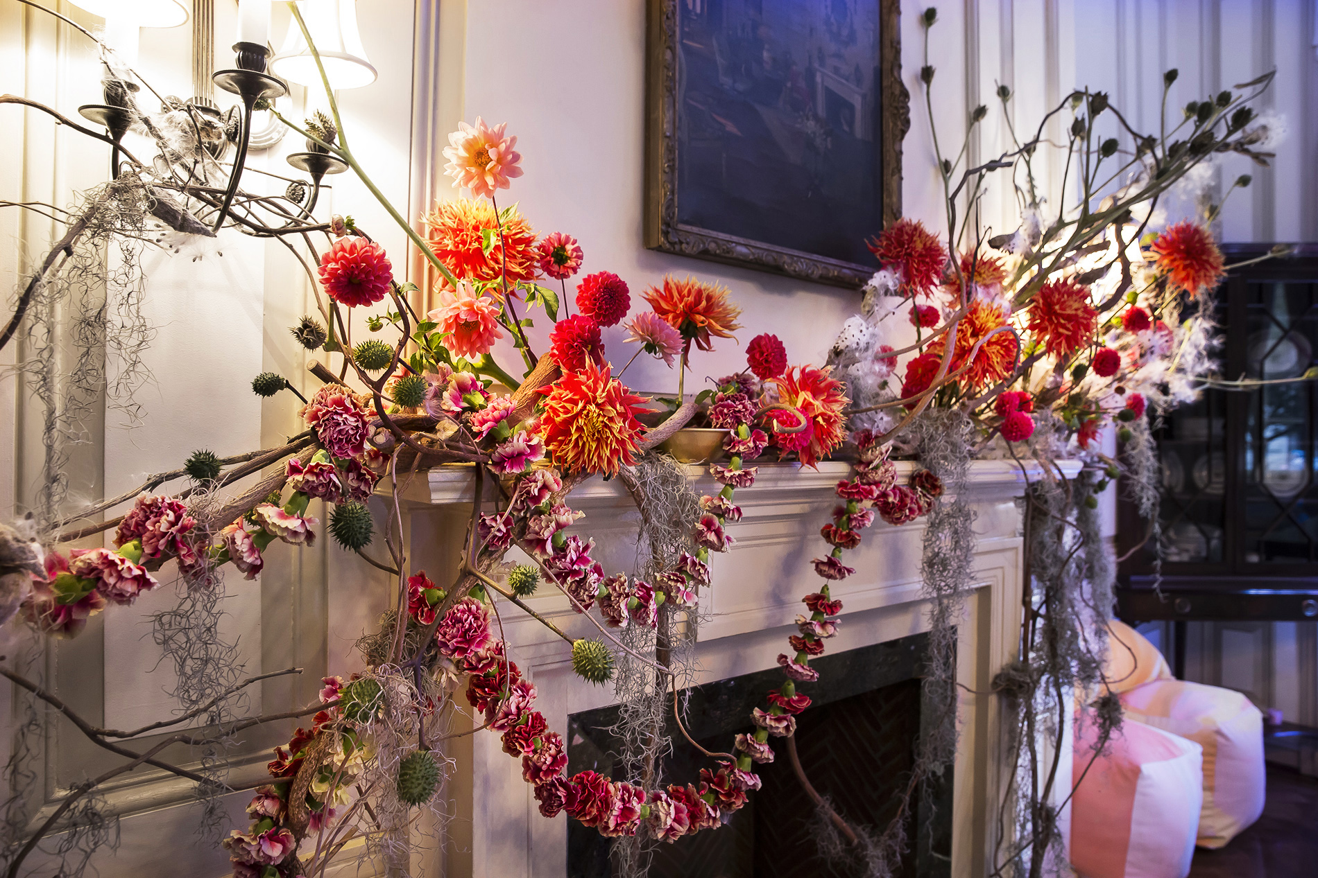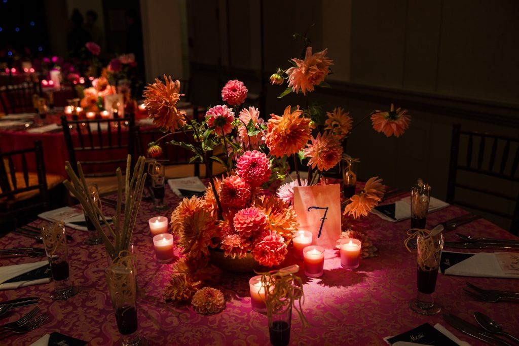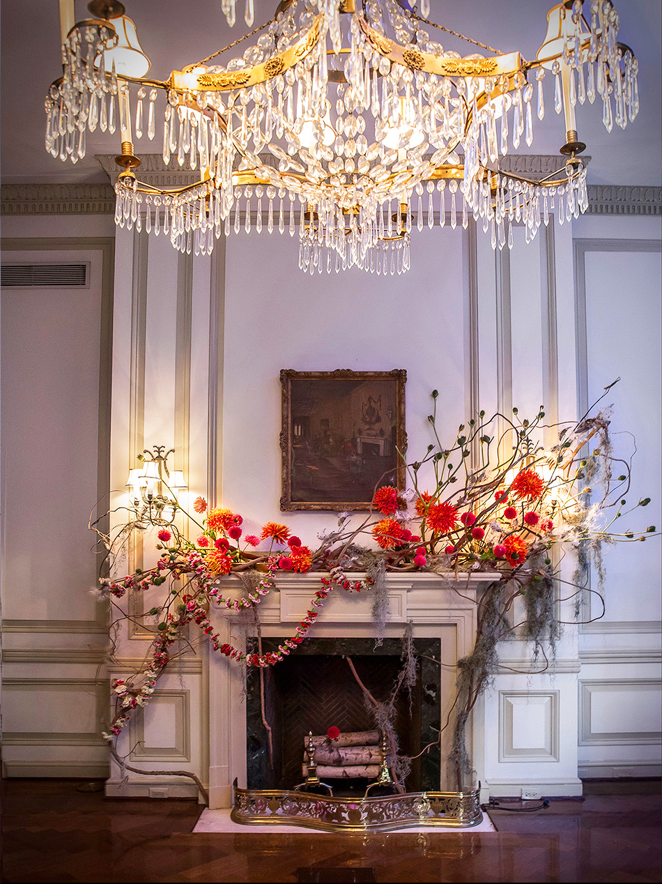 For this Autumn wedding, the bride and groom stepped into an other-worldly experience. Our team transformed the rooms of the Harold Pratt House, an Historic Upper East Side mansion, into something from an unknown future or past, partially overgrown, partially aglow with the hot colors of the season’s best dahlias. Garlands of two-toned Dianthus festooned the architecture, and a massive escort card installation took the form of an oozing volcano of poisonous castor pods. The couple sat at dinner under a cyclone of fragrant local tuberose and Spanish moss, against a backdrop of starry night LED lights, with spectacular velvety dahlias in three palettes exploding from the dining tables.