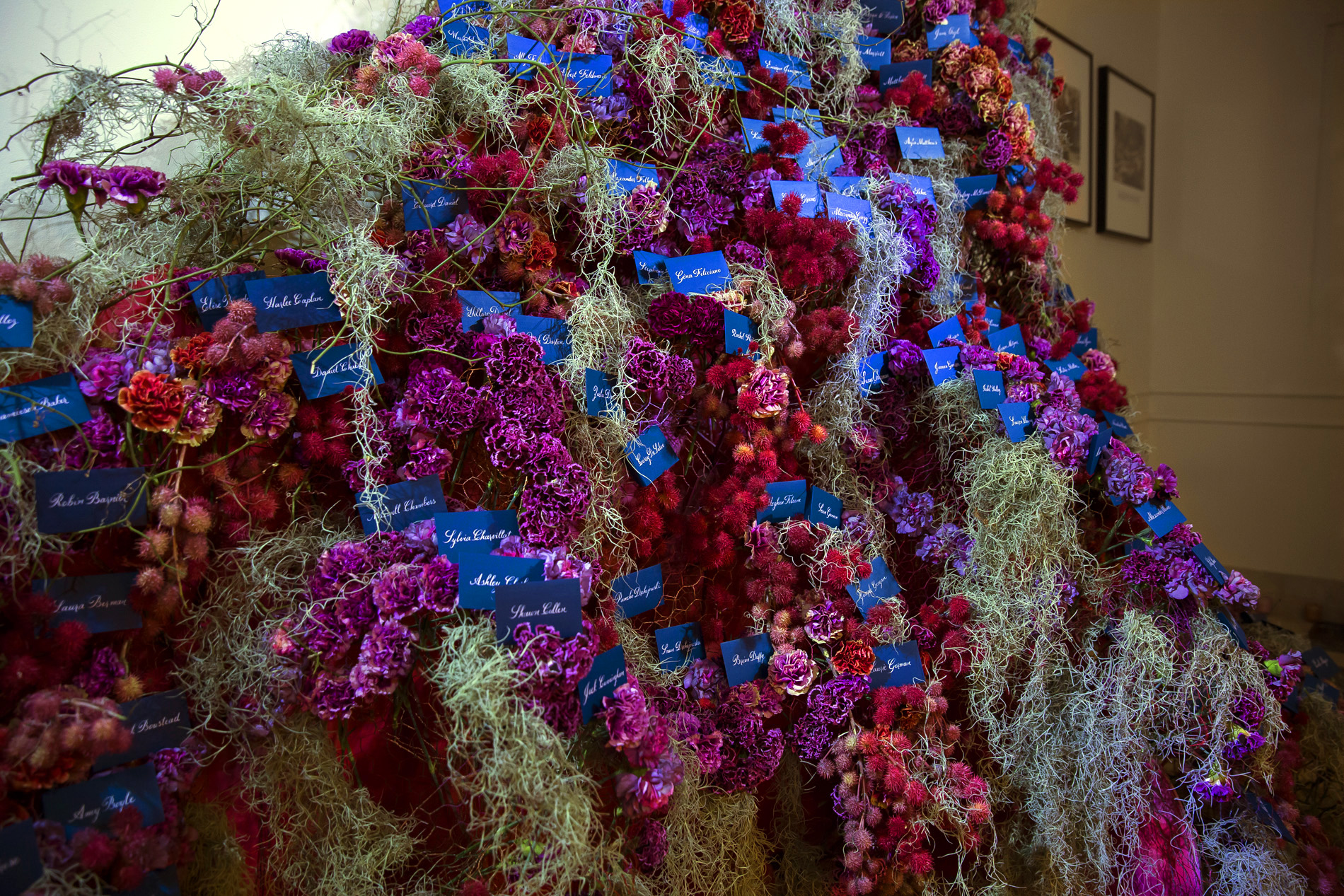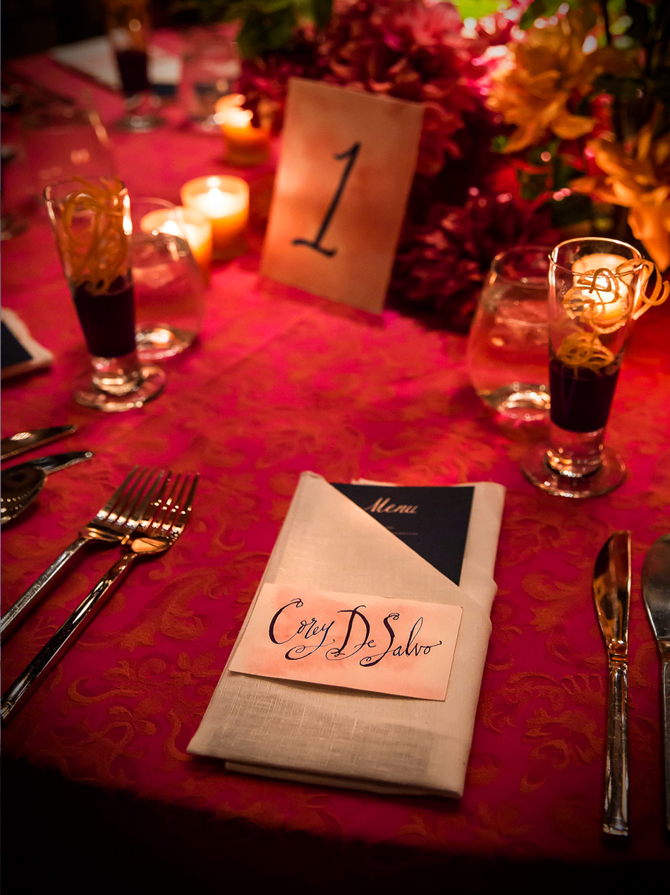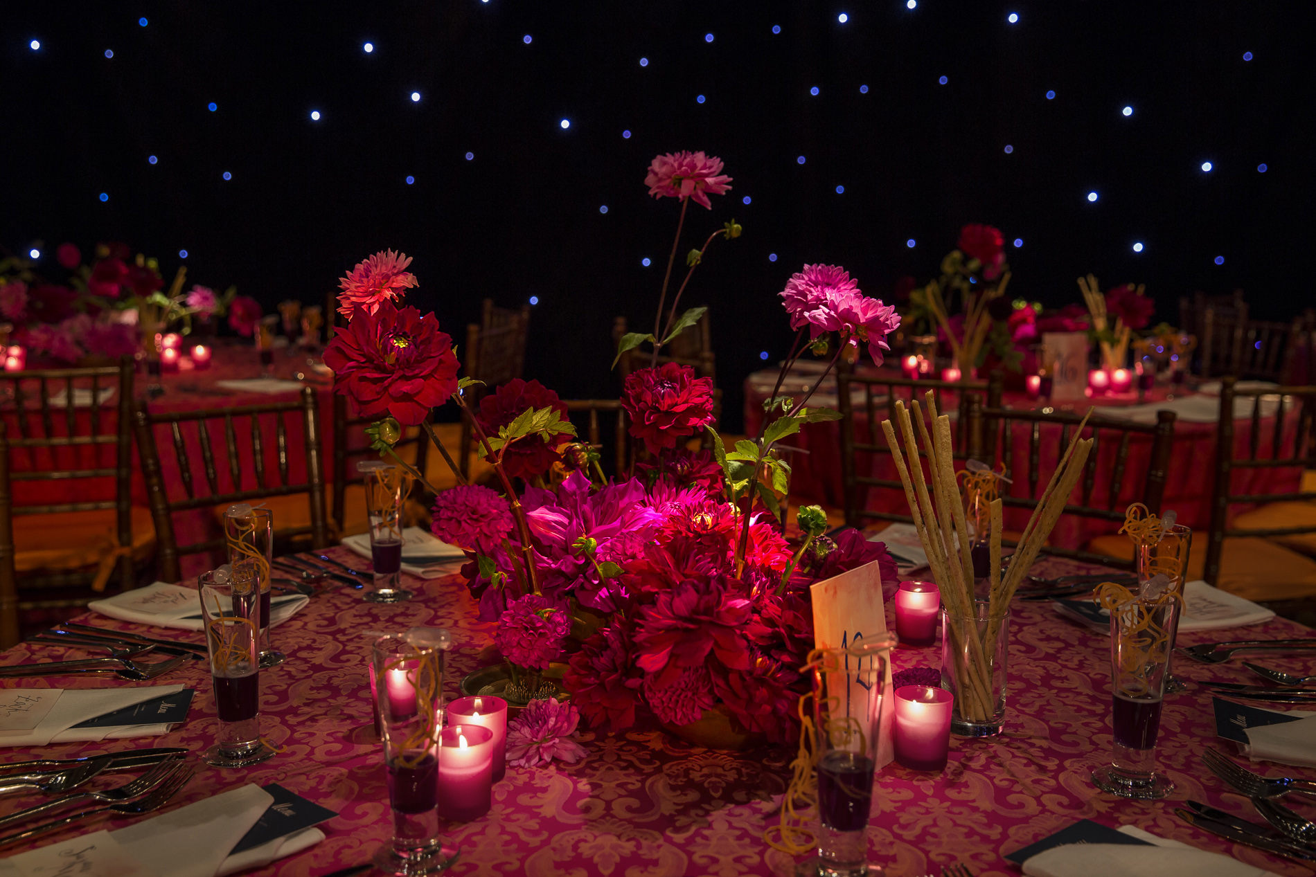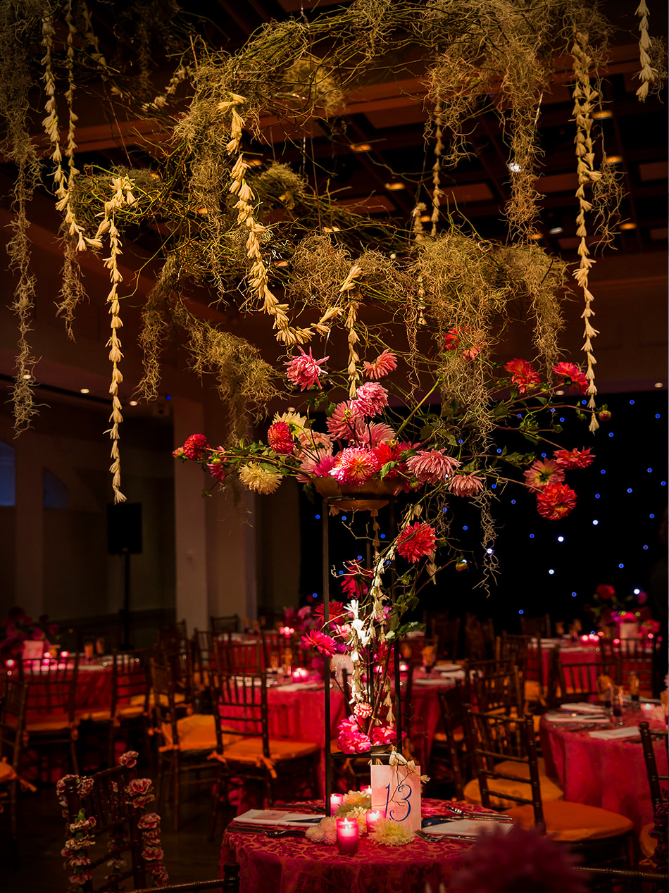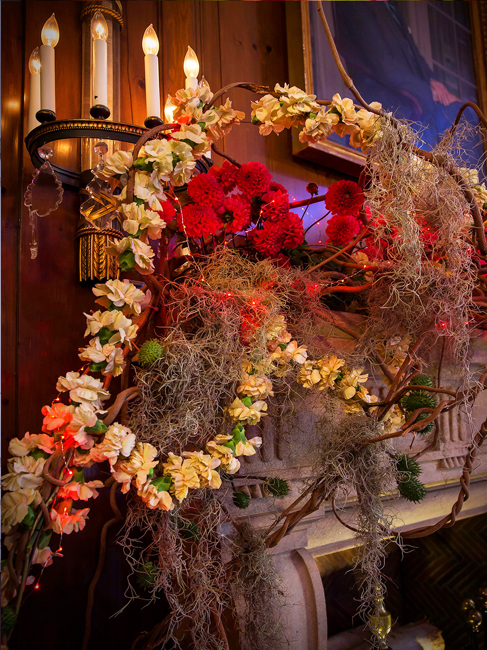 For this Autumn wedding, the bride and groom stepped into an other-worldly experience. Our team transformed the rooms of the Harold Pratt House, an Historic Upper East Side mansion, into something from an unknown future or past, partially overgrown, partially aglow with the hot colors of the season’s best dahlias. Garlands of two-toned Dianthus festooned the architecture, and a massive escort card installation took the form of an oozing volcano of poisonous castor pods. The couple sat at dinner under a cyclone of fragrant local tuberose and Spanish moss, against a backdrop of starry night LED lights, with spectacular velvety dahlias in three palettes exploding from the dining tables.