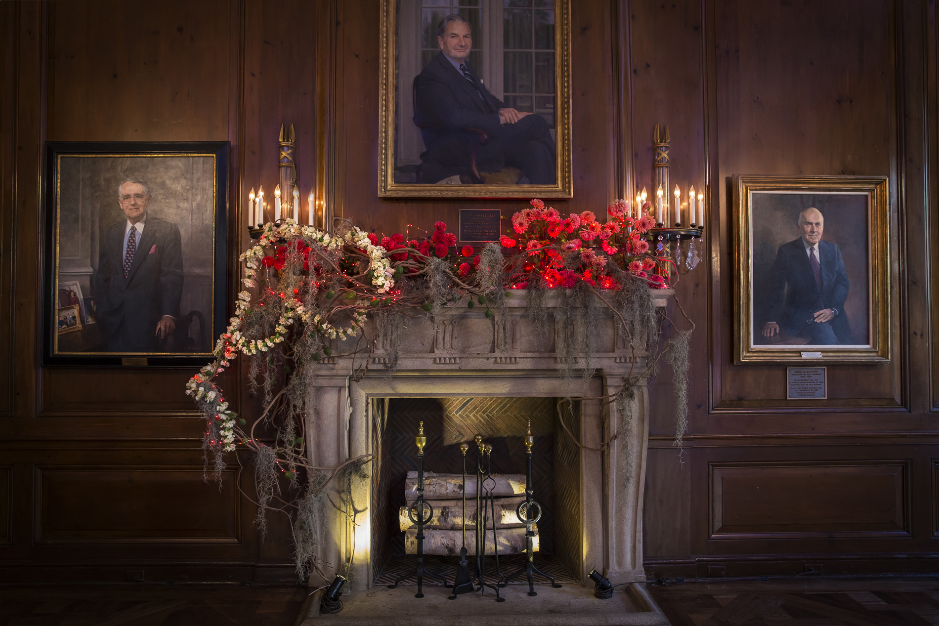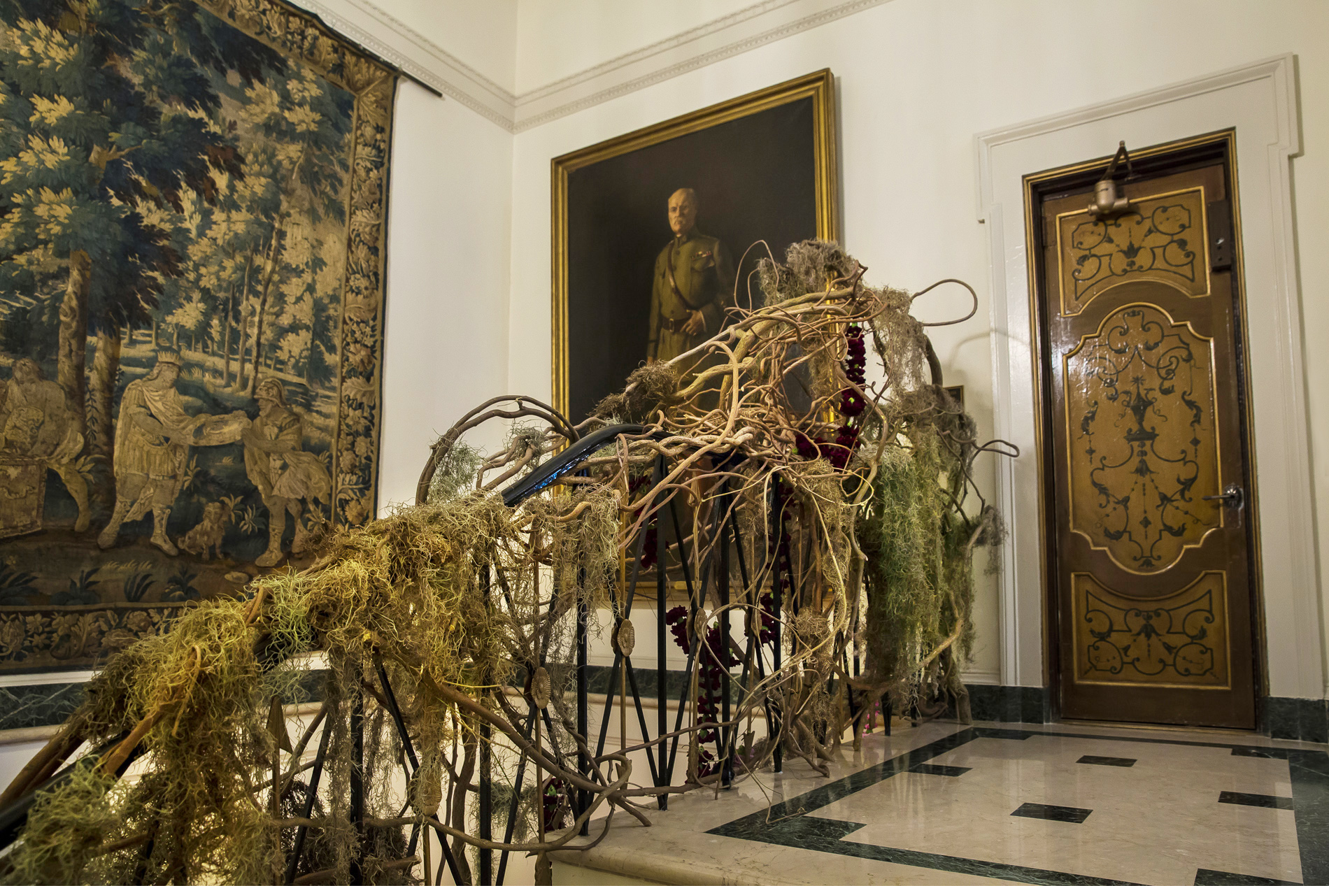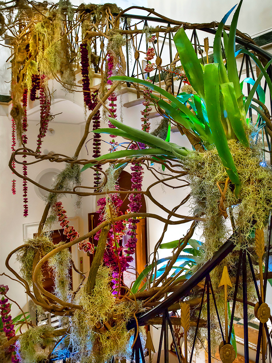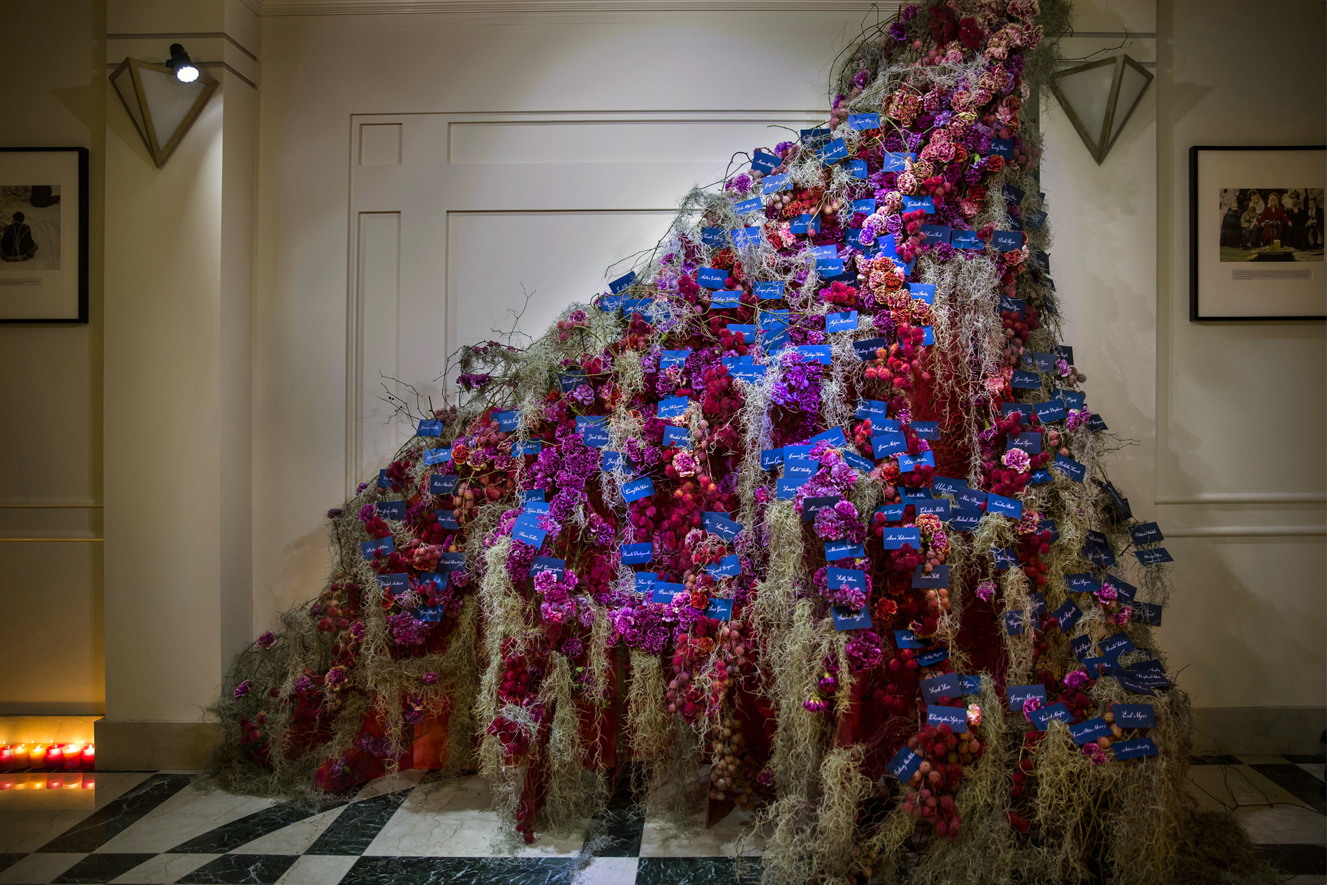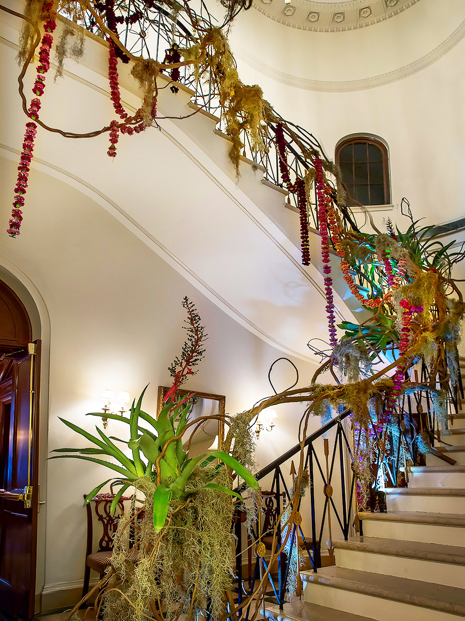 For this Autumn wedding, the bride and groom stepped into an other-worldly experience. Our team transformed the rooms of the Harold Pratt House, an Historic Upper East Side mansion, into something from an unknown future or past, partially overgrown, partially aglow with the hot colors of the season’s best dahlias. Garlands of two-toned Dianthus festooned the architecture, and a massive escort card installation took the form of an oozing volcano of poisonous castor pods. The couple sat at dinner under a cyclone of fragrant local tuberose and Spanish moss, against a backdrop of starry night LED lights, with spectacular velvety dahlias in three palettes exploding from the dining tables.