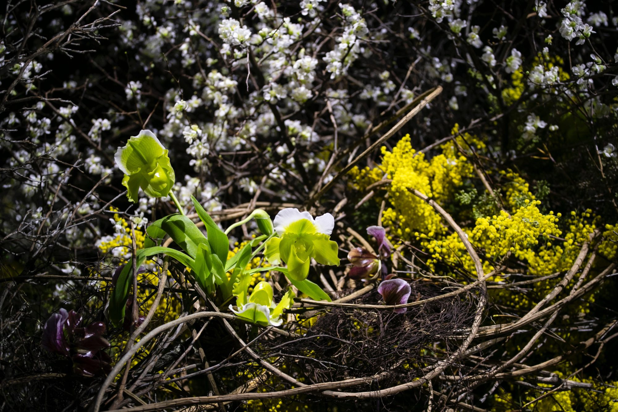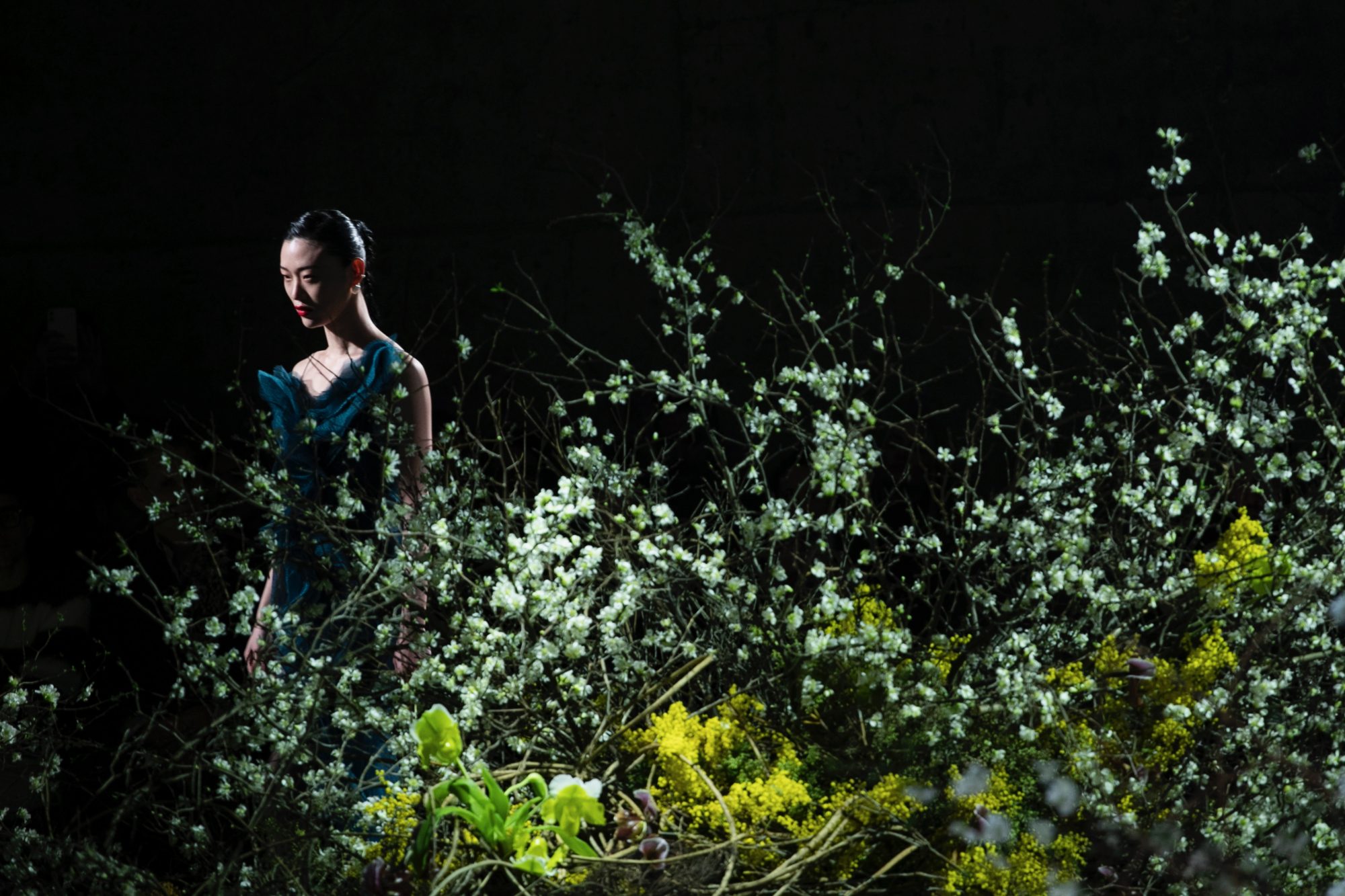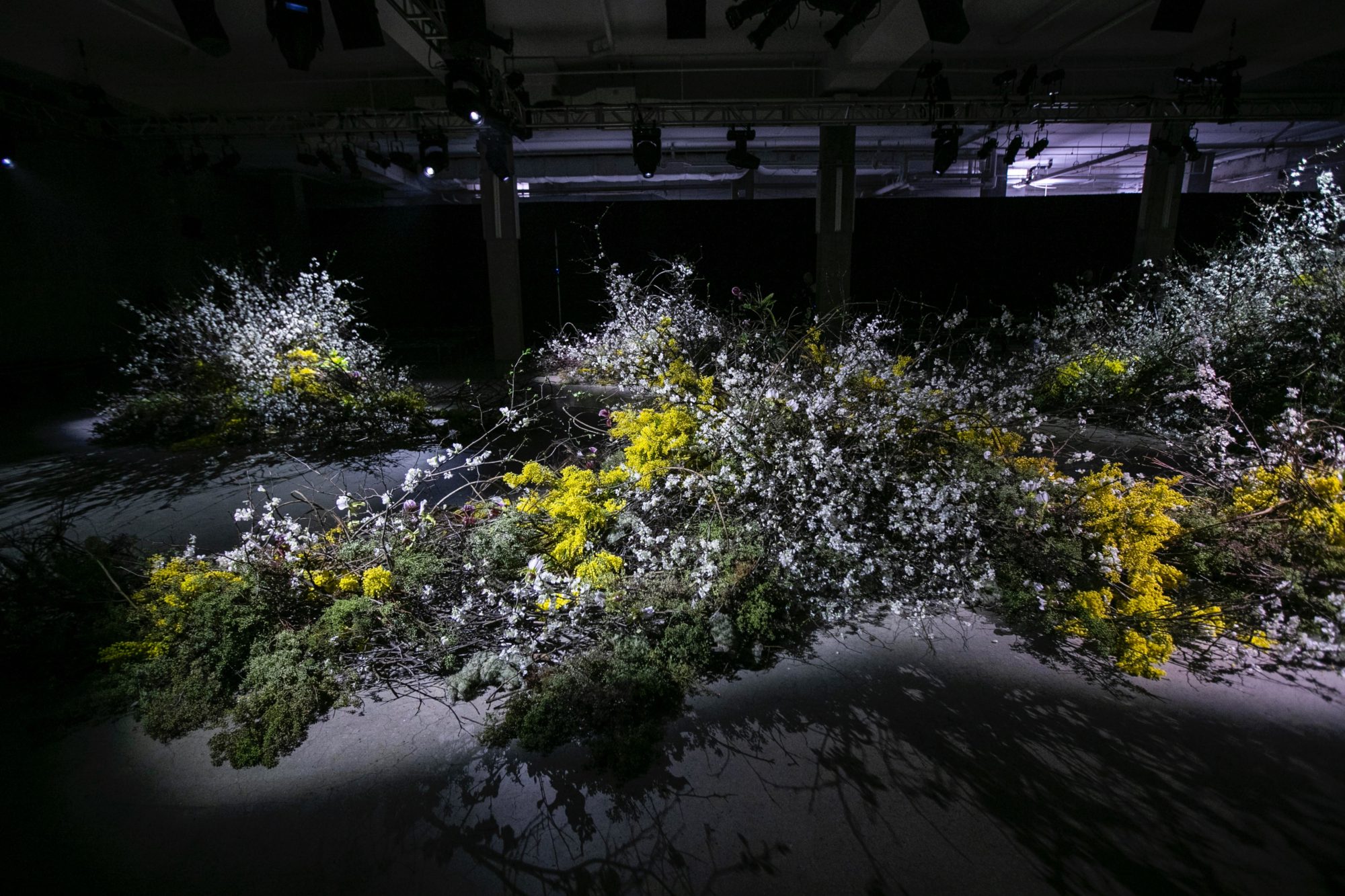 This runway, part beaver dam, part crashing surf, was built of entirely vegetal material, with lichen-covered mountain laurel as both structure and silhouette. A forest of white quince branches frothed and foamed, cascading into small mountain ranges of mimosa and eucalyptus seed heads. Here and there, a Paphiopedilum orchid bobbed to the surface like small otter or beaver building its dam.