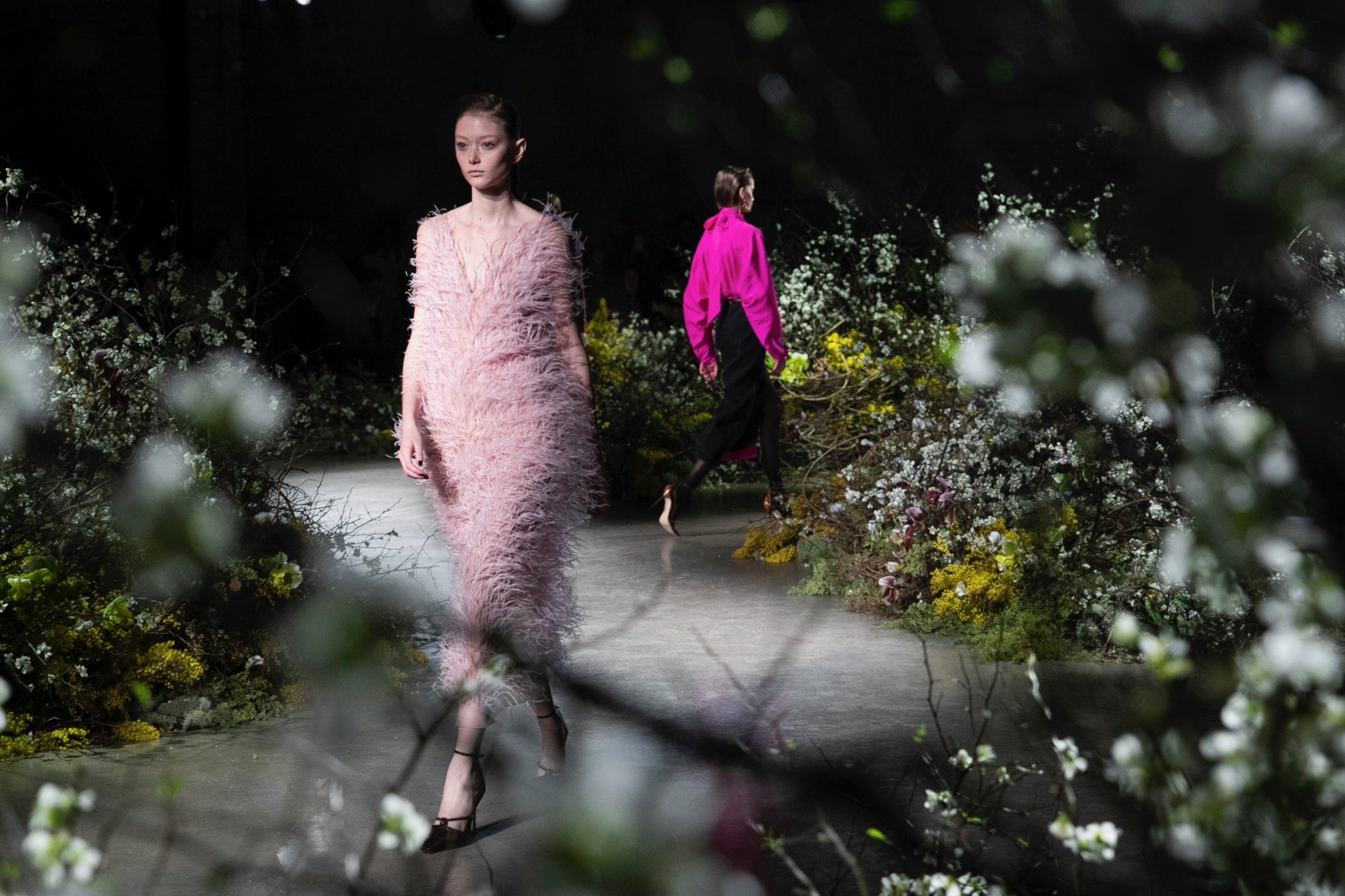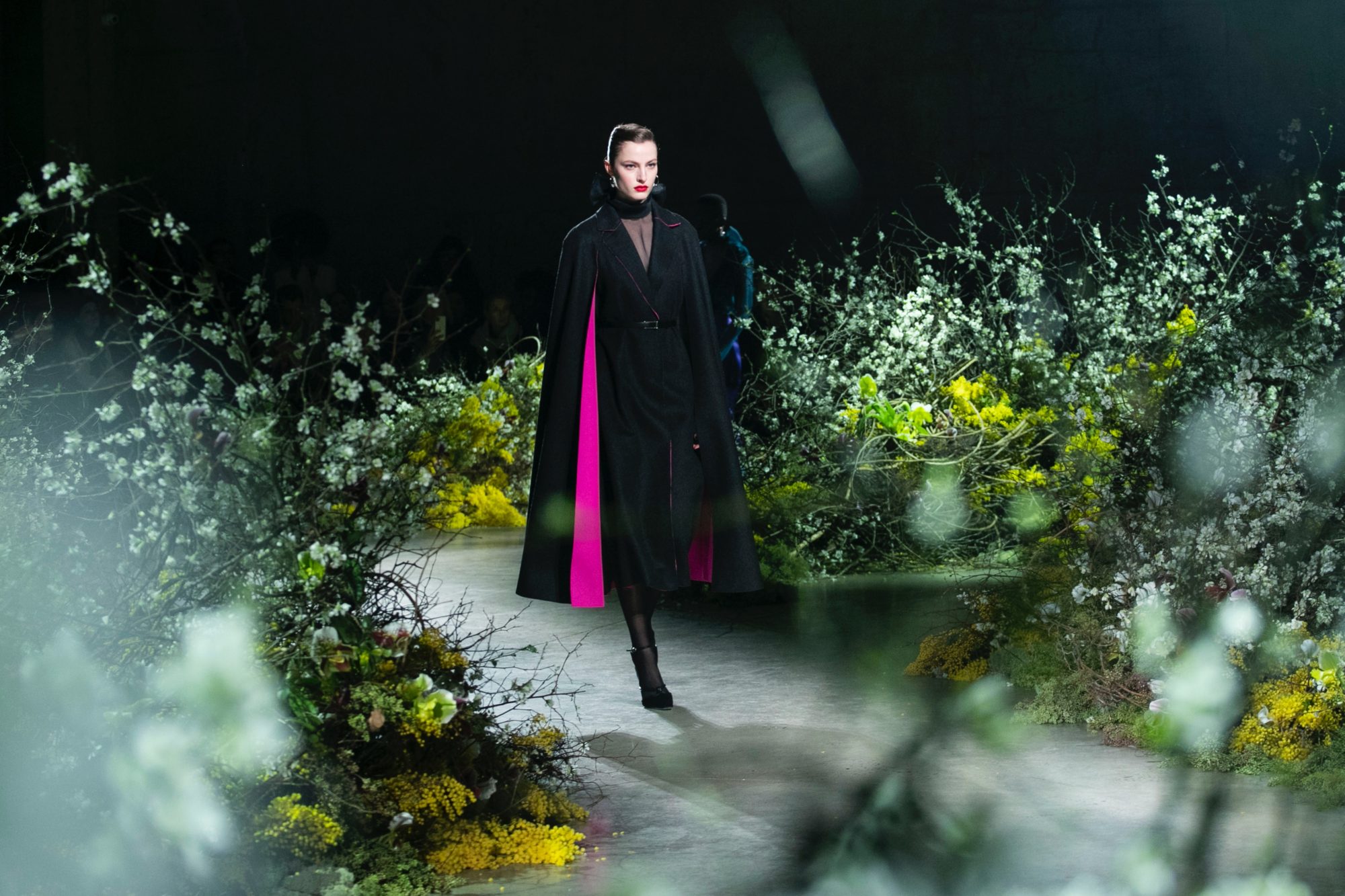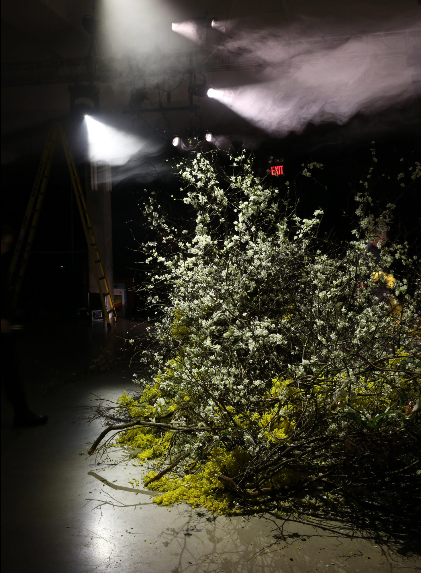 This runway, part beaver dam, part crashing surf, was built of entirely vegetal material, with lichen-covered mountain laurel as both structure and silhouette. A forest of white quince branches frothed and foamed, cascading into small mountain ranges of mimosa and eucalyptus seed heads. Here and there, a Paphiopedilum orchid bobbed to the surface like small otter or beaver building its dam.