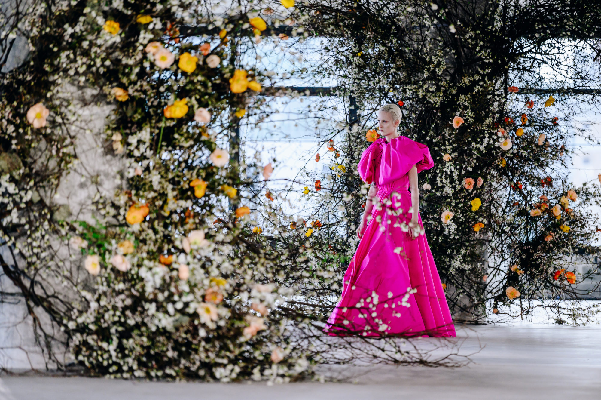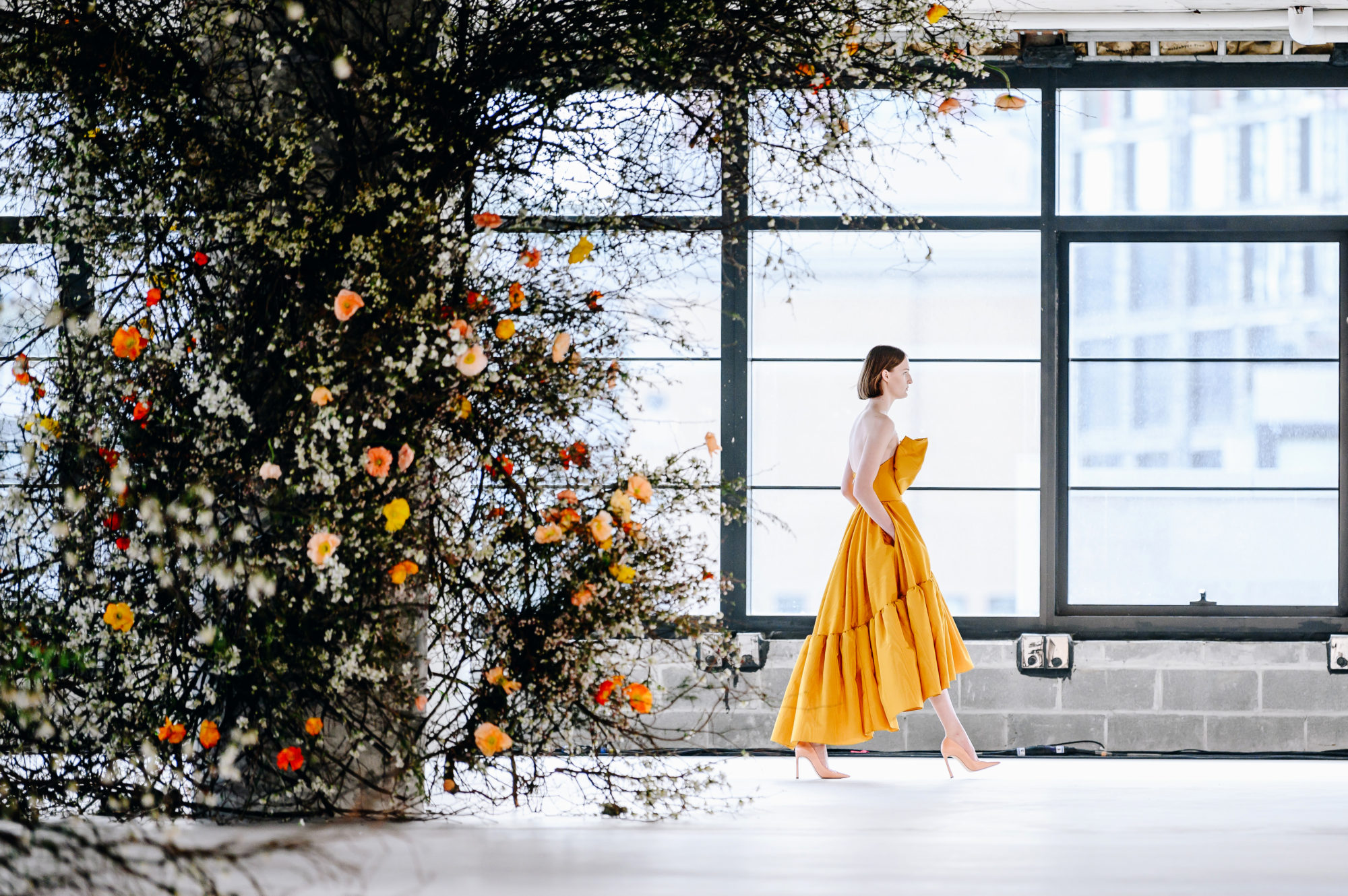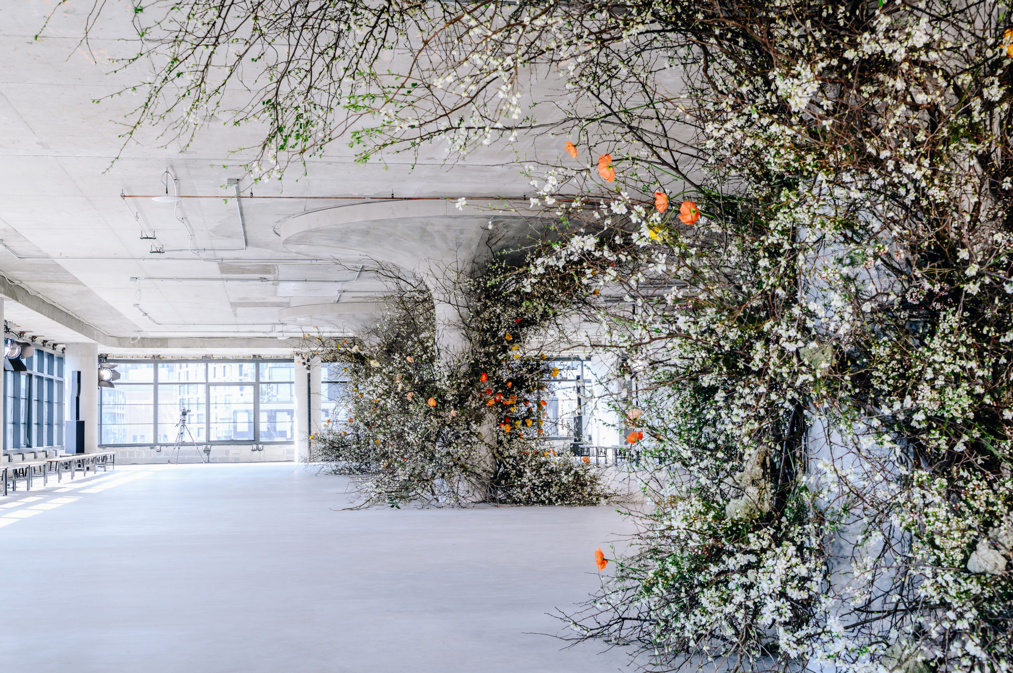 This set design began with a mass of the season’s thorniest: quince, assembled to appear to creep and metastasize upon the architecture of this unfinished industrial interior. This slightly fluffy, spiny thicket of lichen expanded onto the ceilings and walls for a runway backdrop both exultant and foreboding.