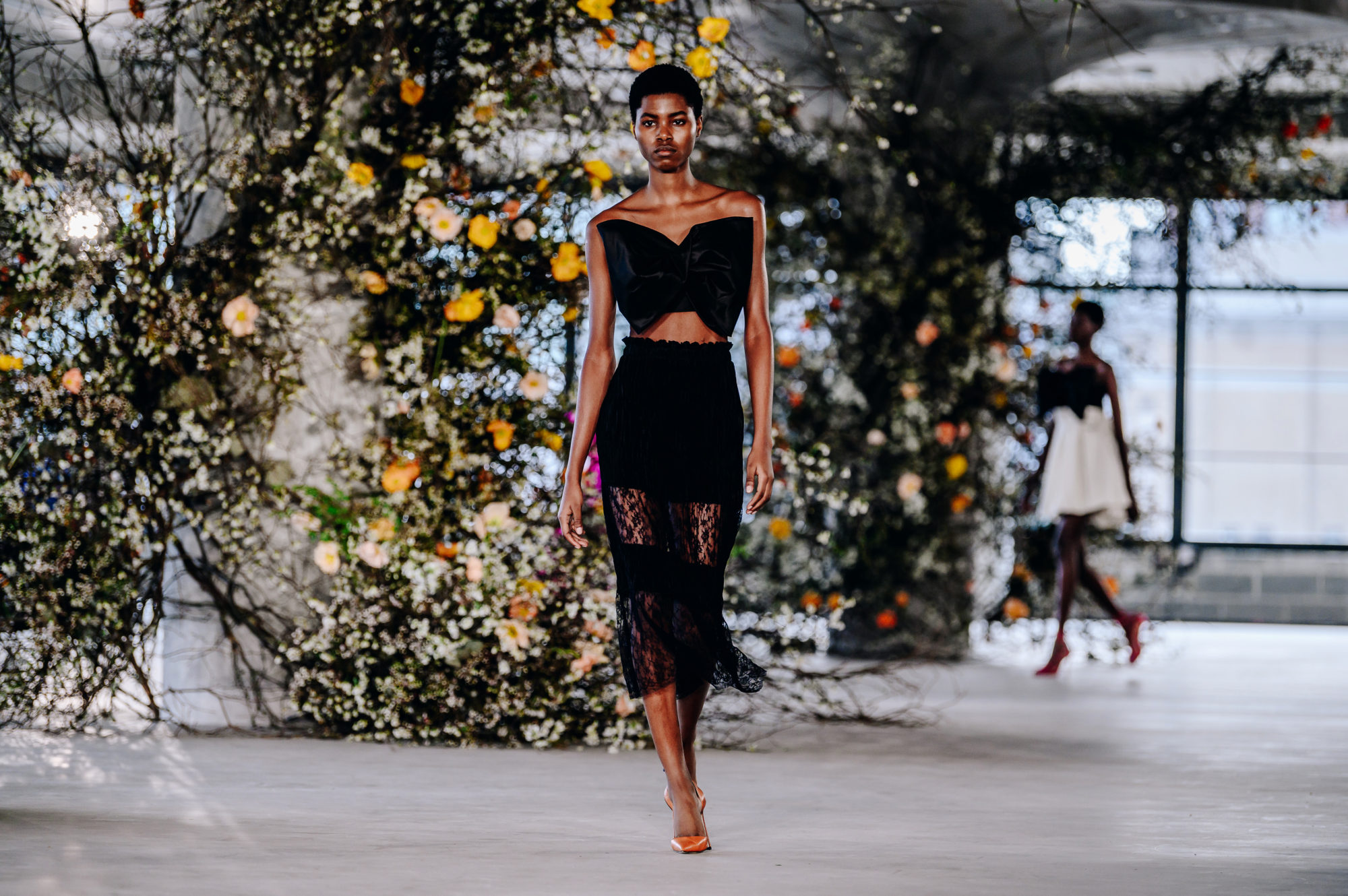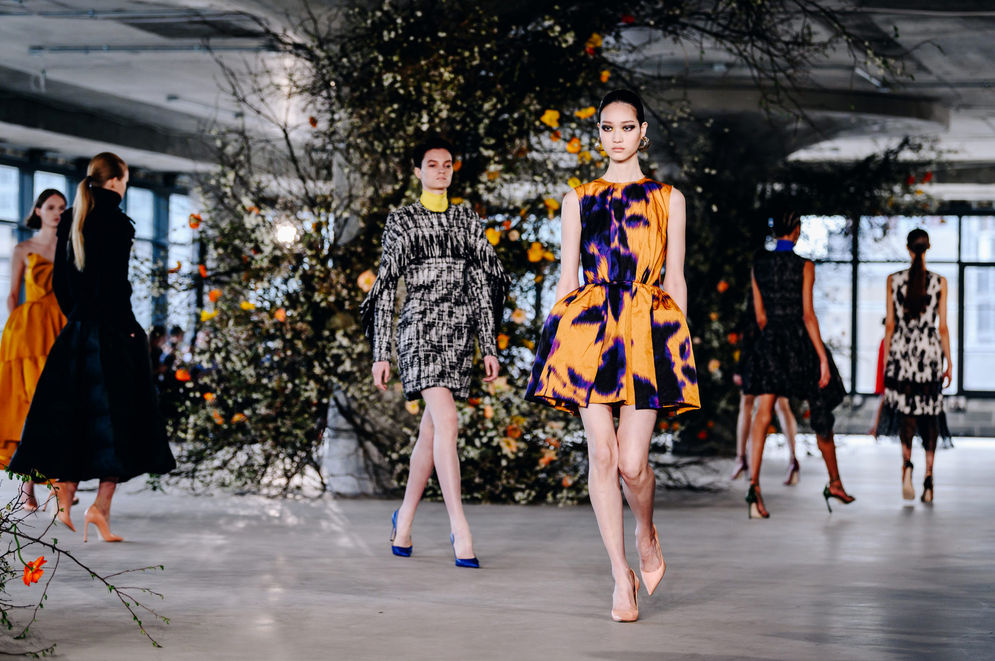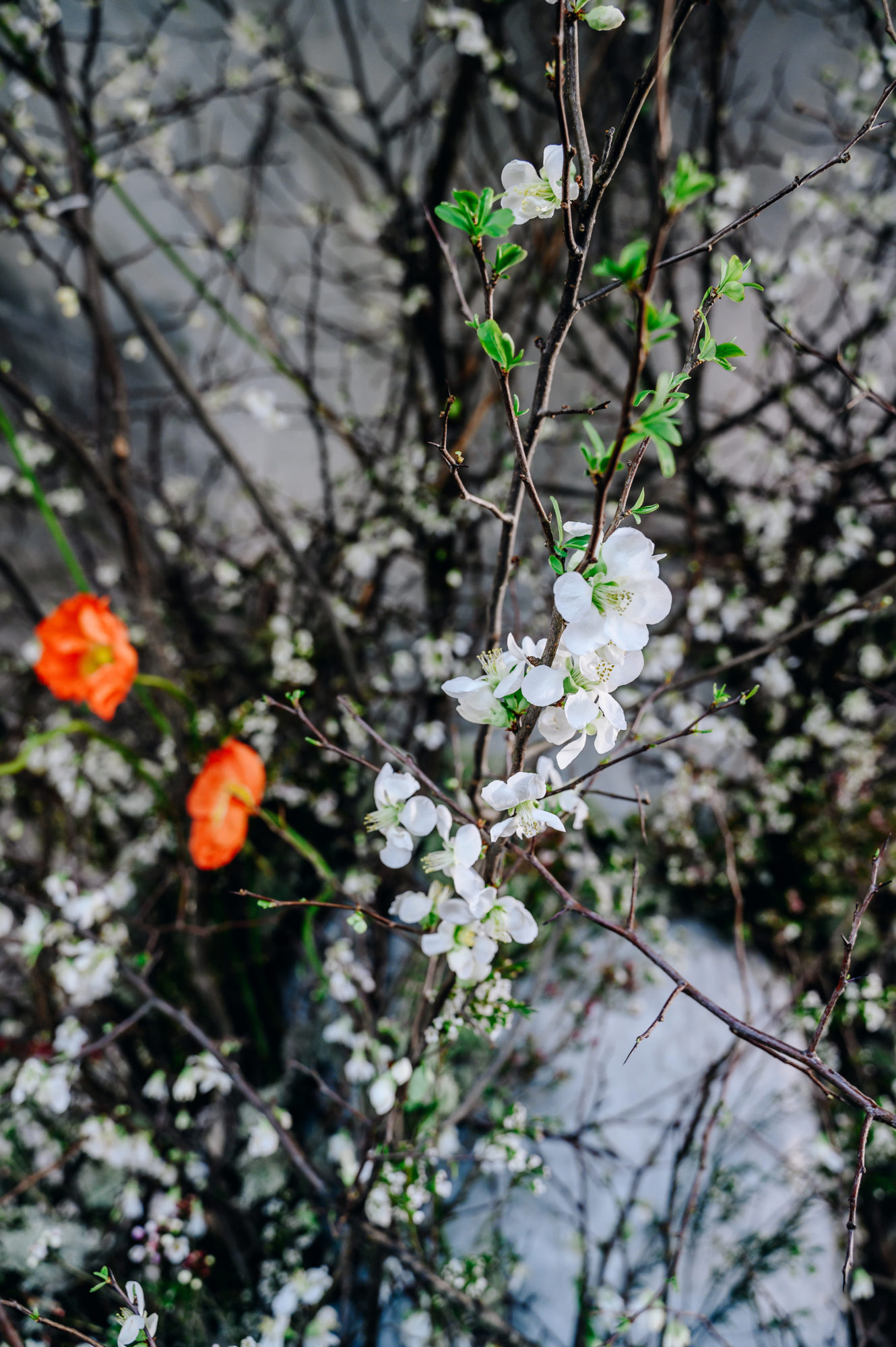 This set design began with a mass of the season’s thorniest: quince, assembled to appear to creep and metastasize upon the architecture of this unfinished industrial interior. This slightly fluffy, spiny thicket of lichen expanded onto the ceilings and walls for a runway backdrop both exultant and foreboding.