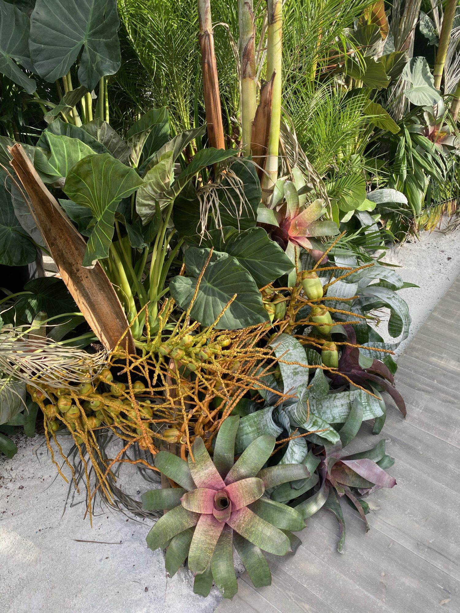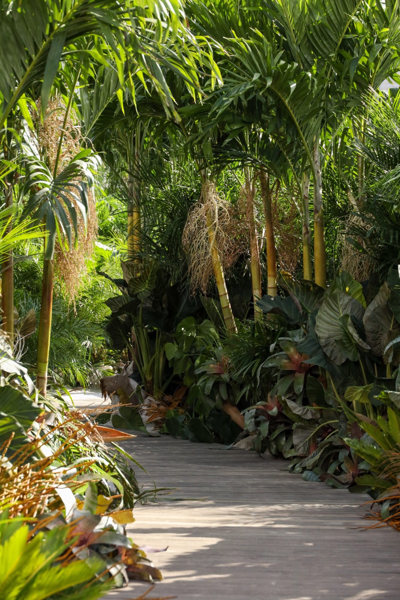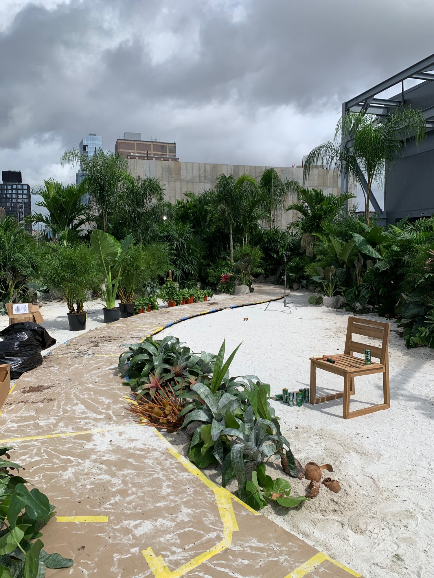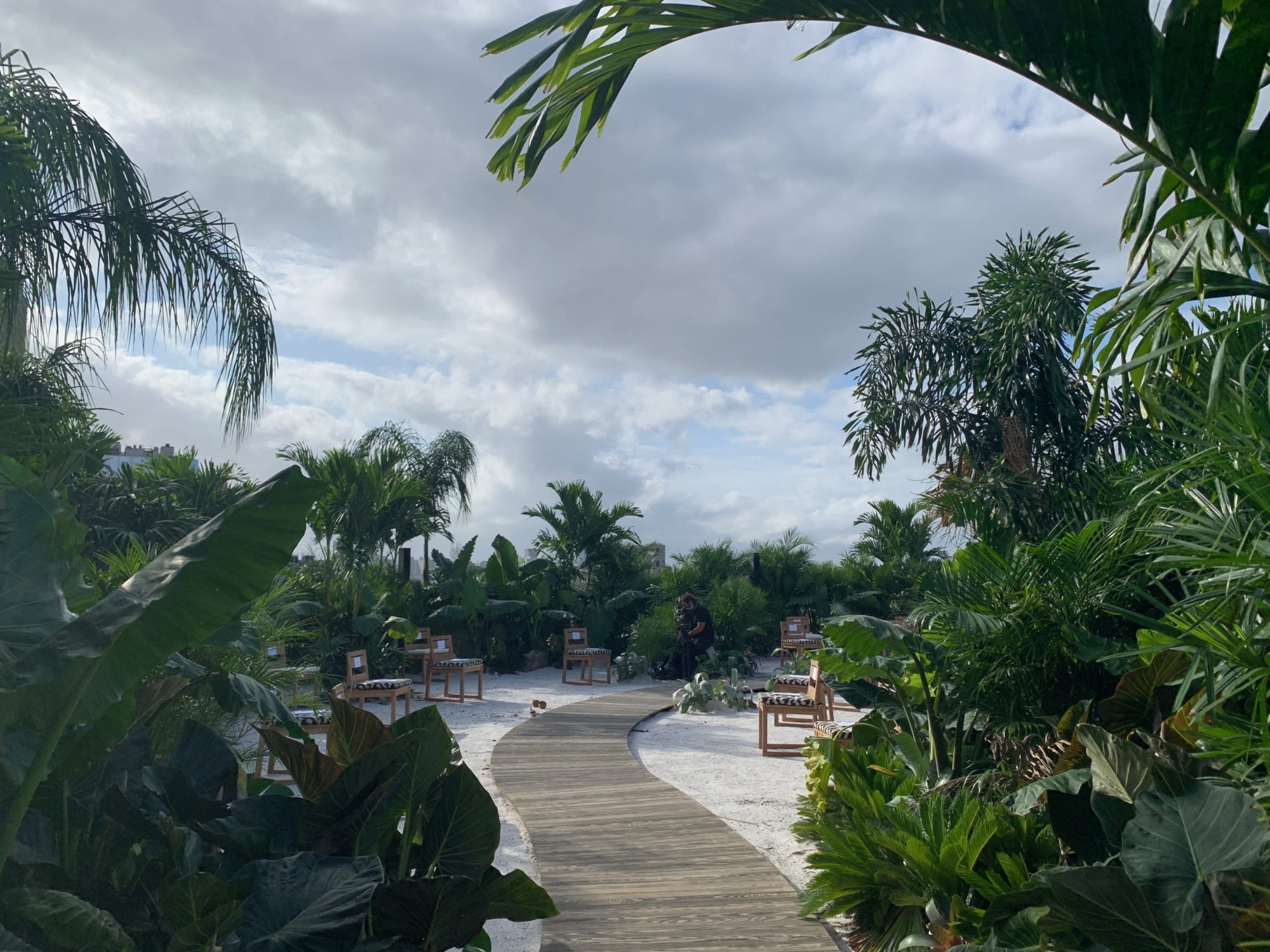 While 2020 wore on, we conjured Tulum in a runway jungle garden and beach as respite for weary, travel hungry New Yorkers. Massive 14 foot palms, giant alocasias, a bevy of stripey bromeliads and the odd coconut cluster made up some of the 900 or so plants we employed in the design. All were donated following the show.