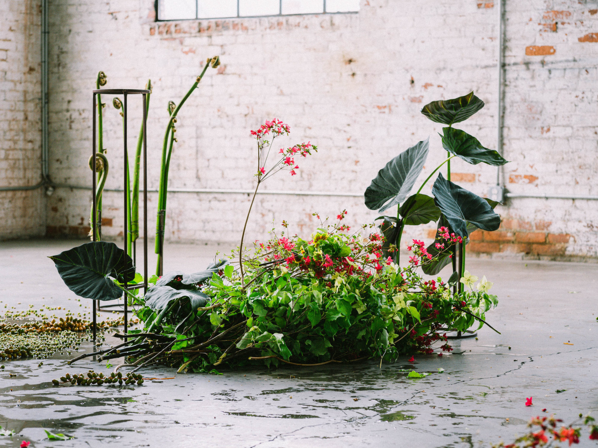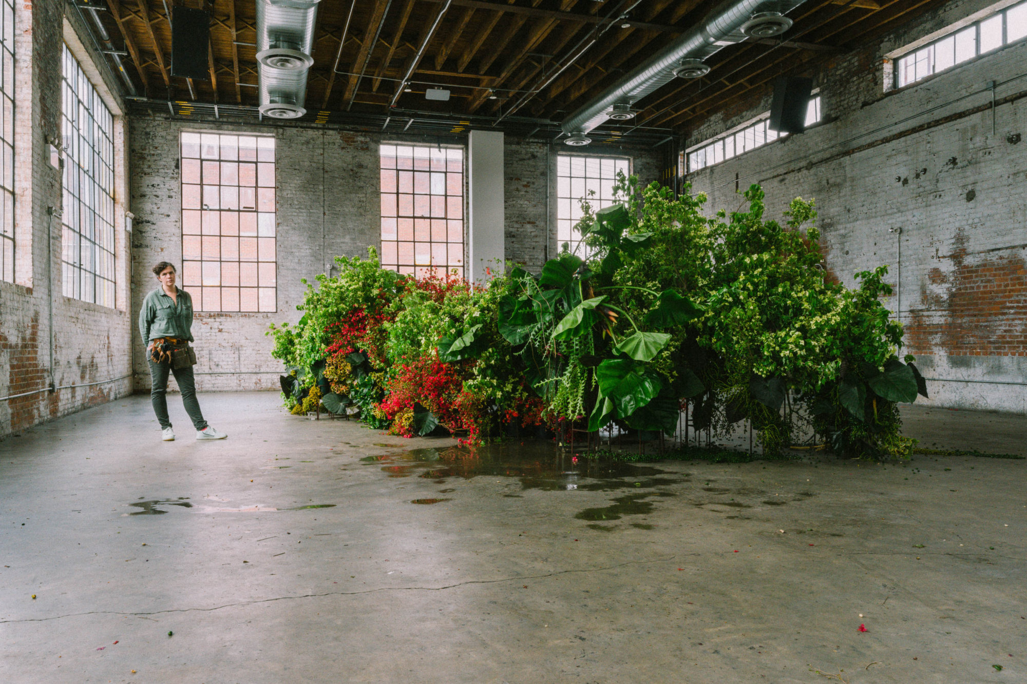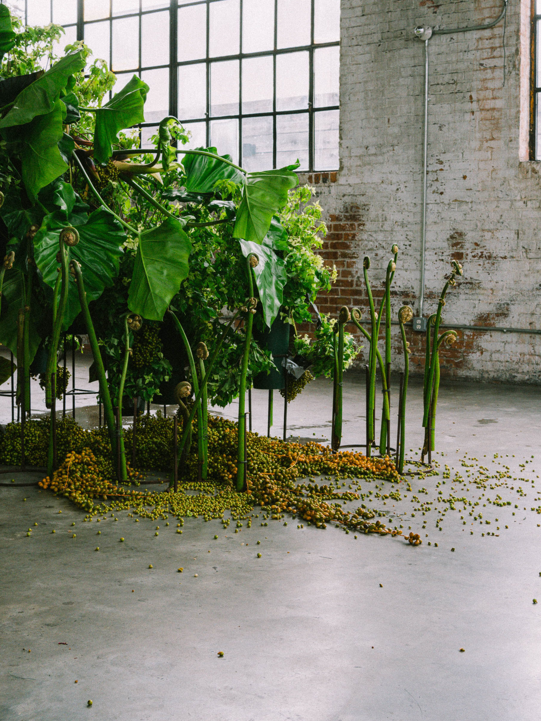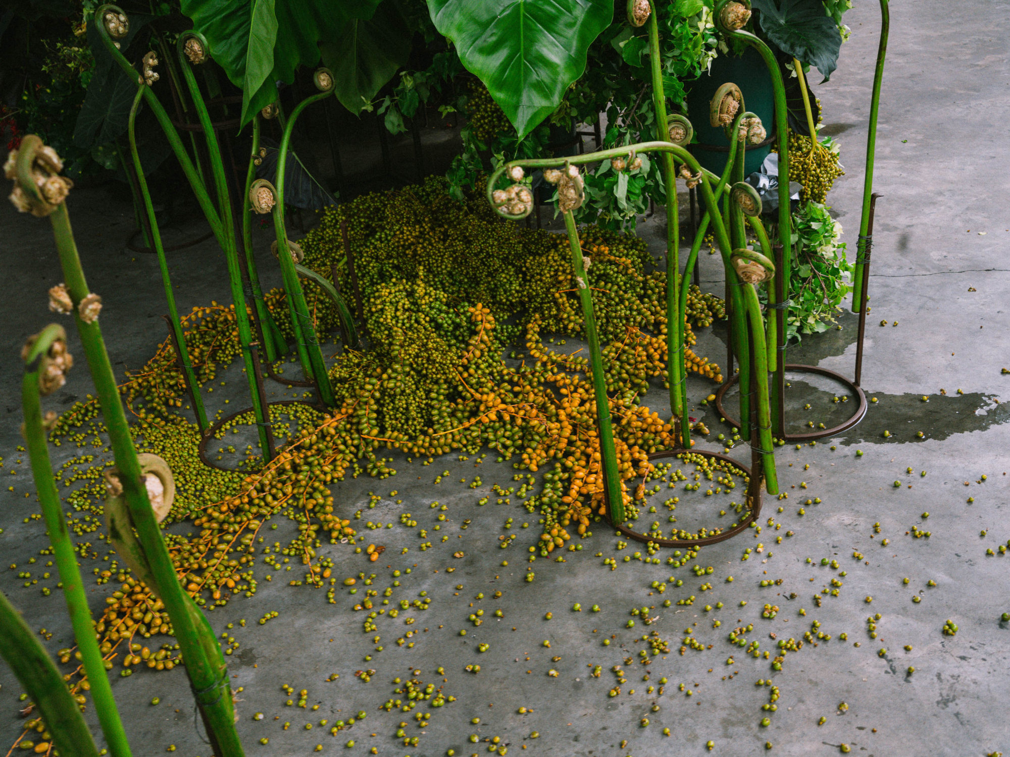 In April of 2023, Emily and 30 or so students from all over the world created this belching, snorting Kimodo dragon from heaps of carmine azalea, dogwood and several jurassic-scaled philodendrons. Its guts poured on the floor, spilling between the exaggerated forms of the massive fiddleheads of Australian tree ferns.
