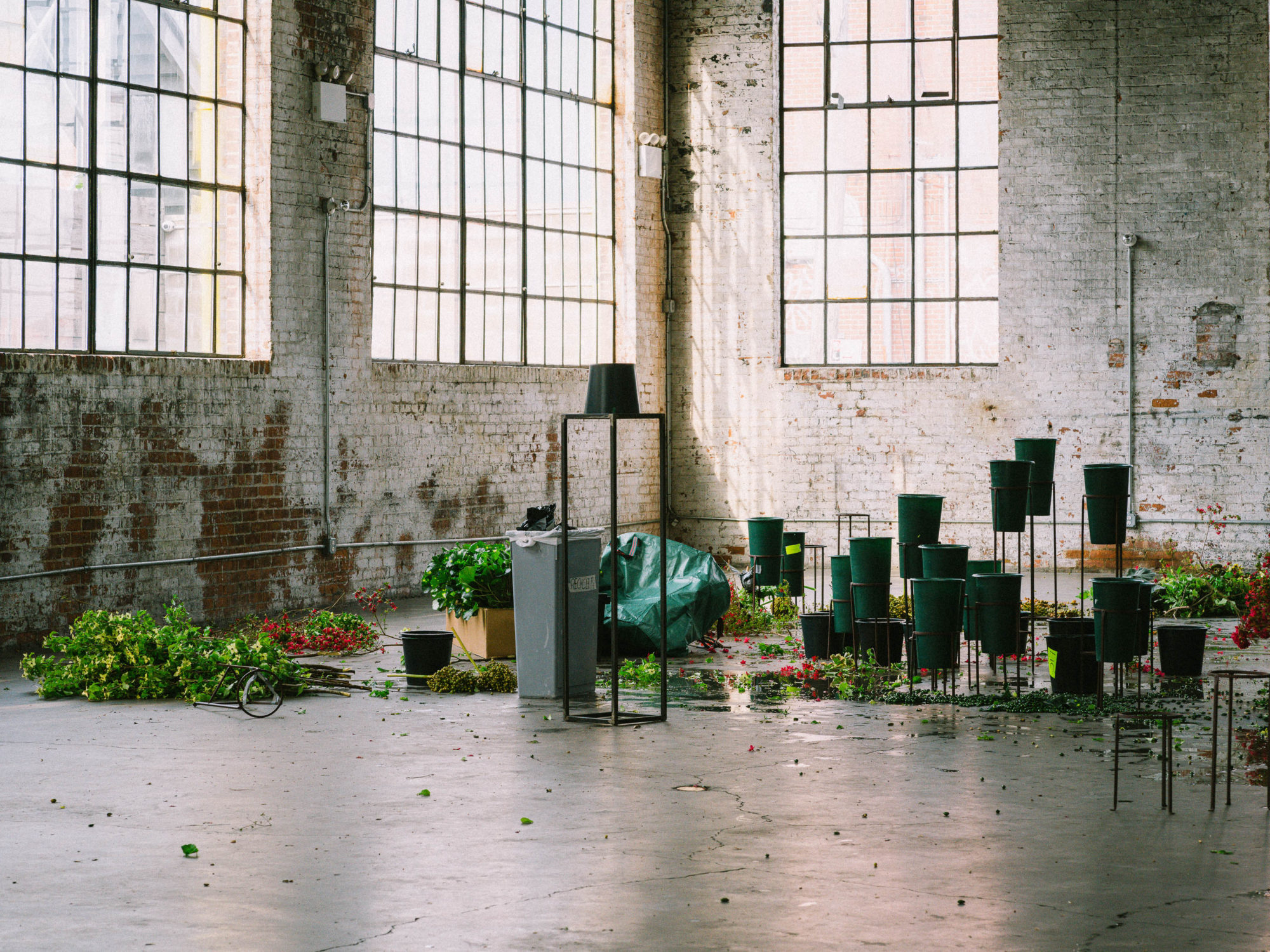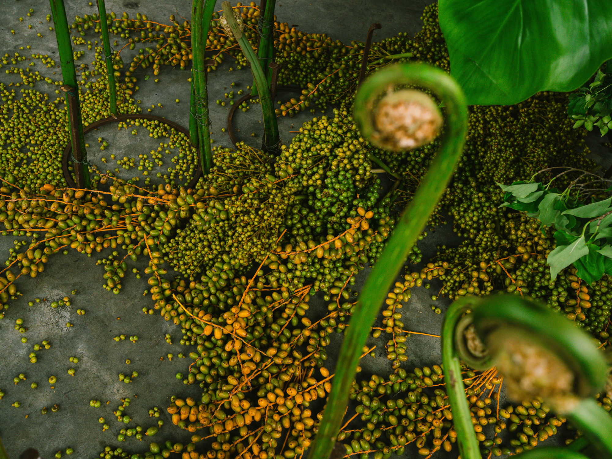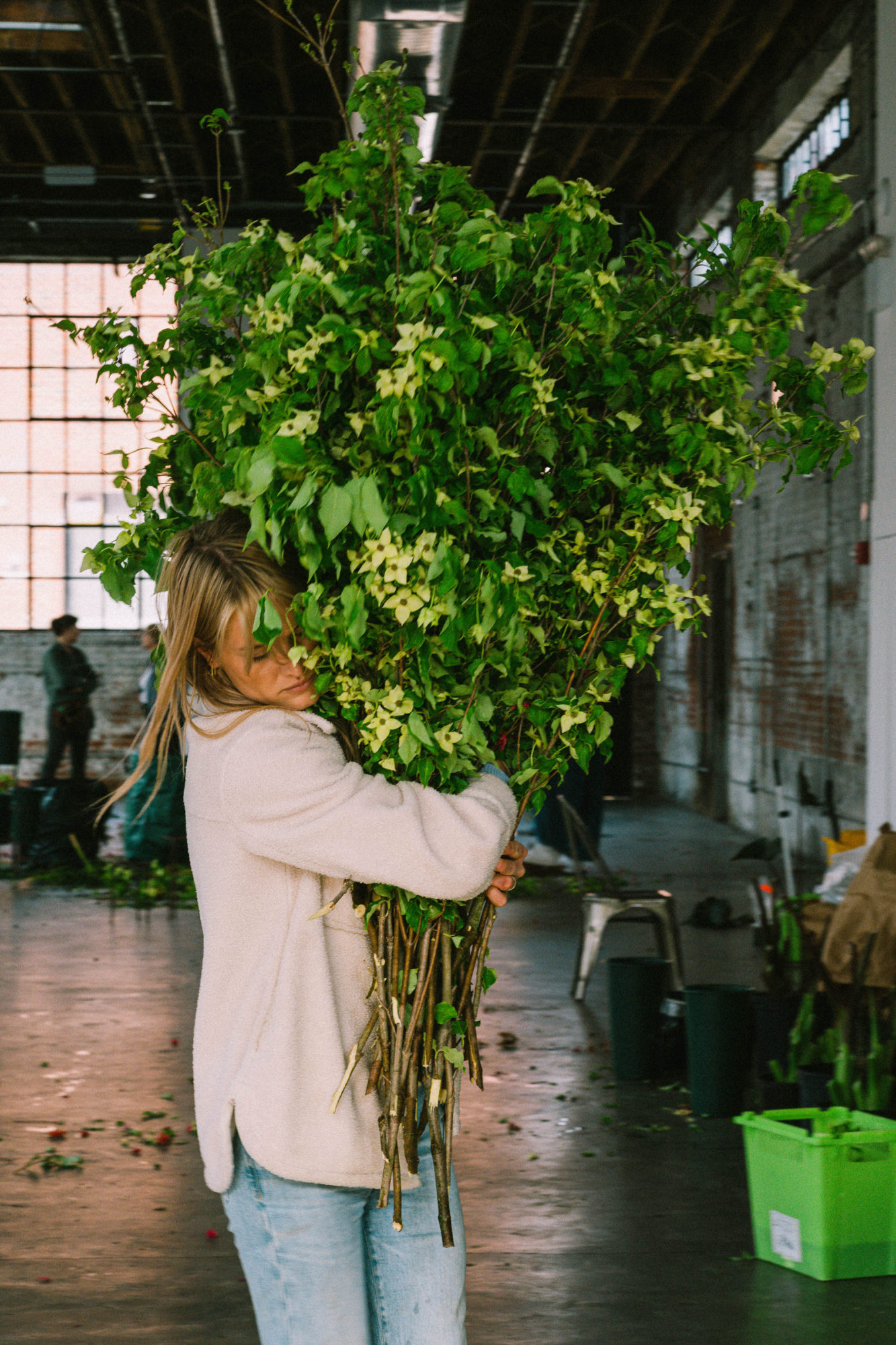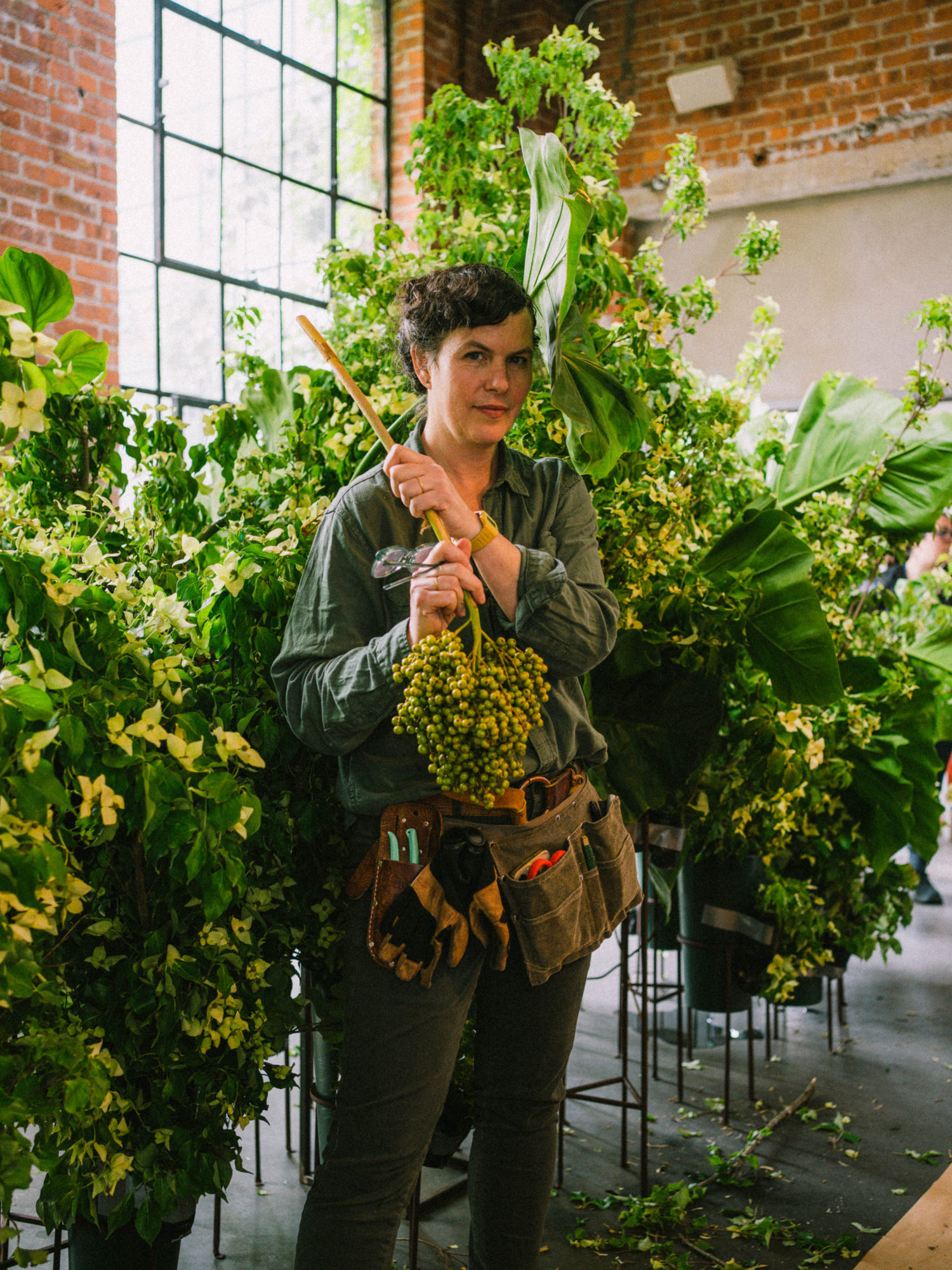 In April of 2023, Emily and 30 or so students from all over the world created this belching, snorting Kimodo dragon from heaps of carmine azalea, dogwood and several jurassic-scaled philodendrons. Its guts poured on the floor, spilling between the exaggerated forms of the massive fiddleheads of Australian tree ferns.
