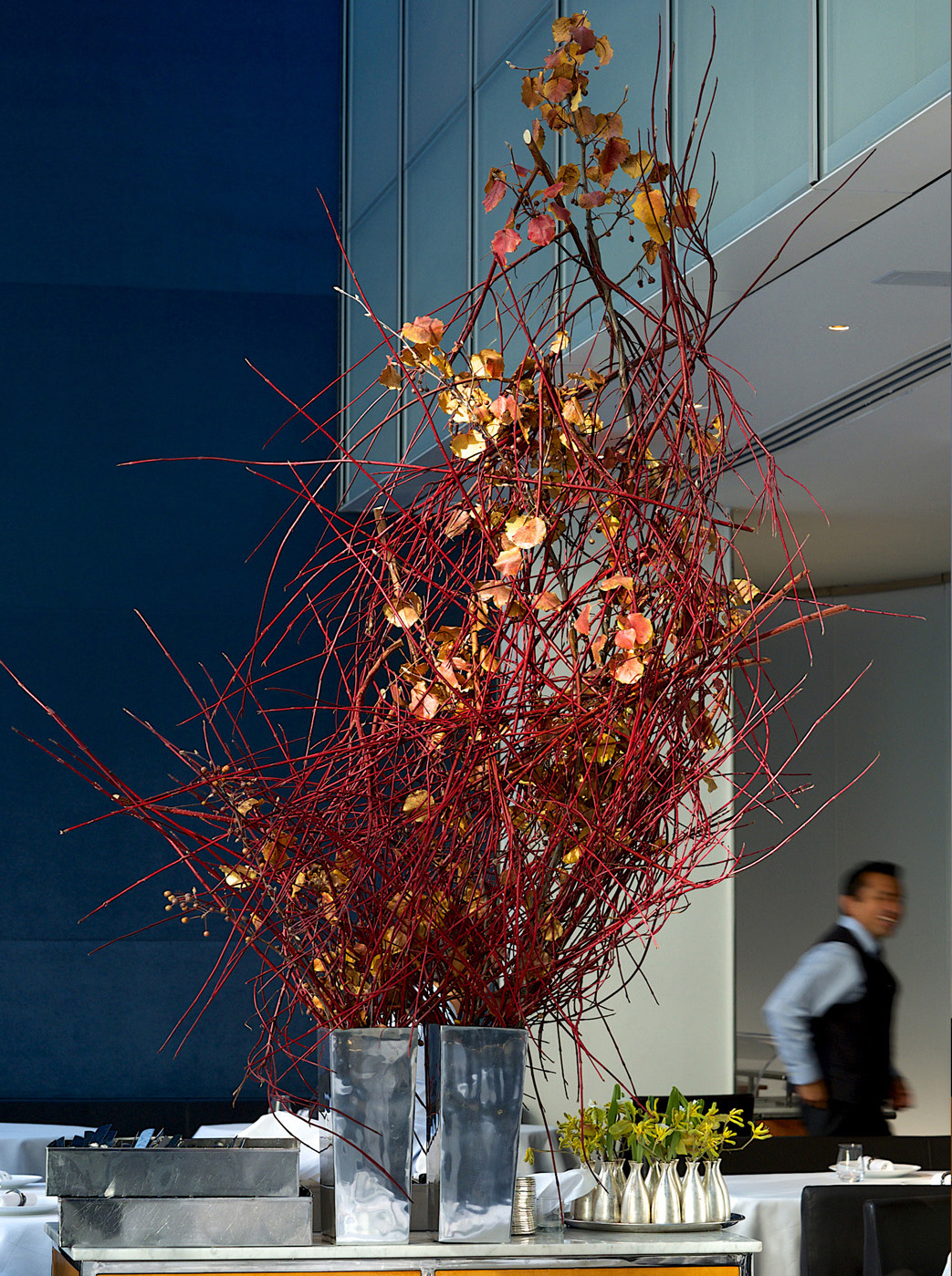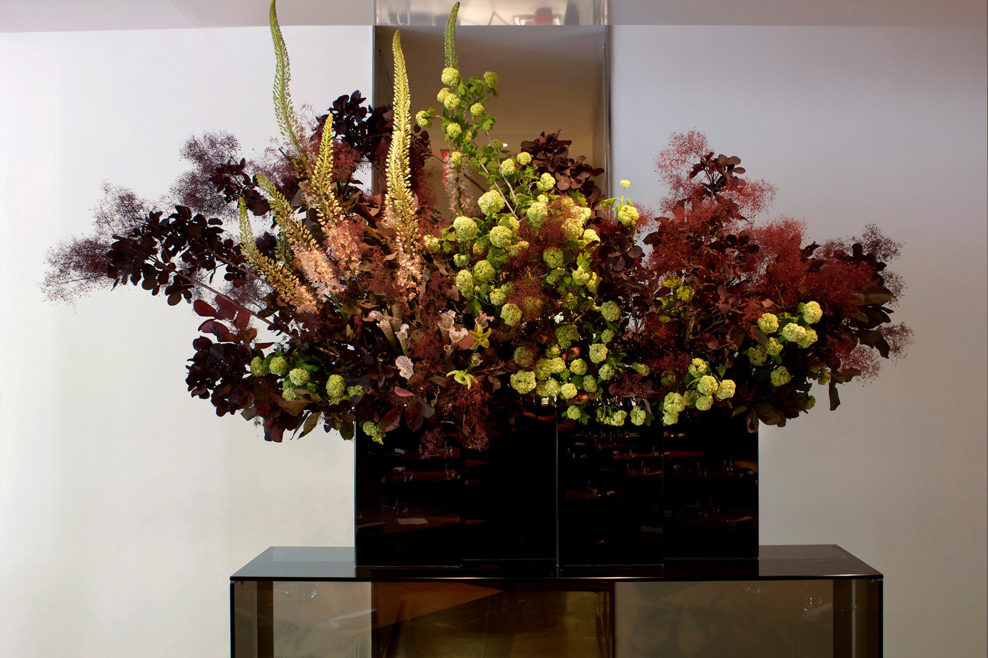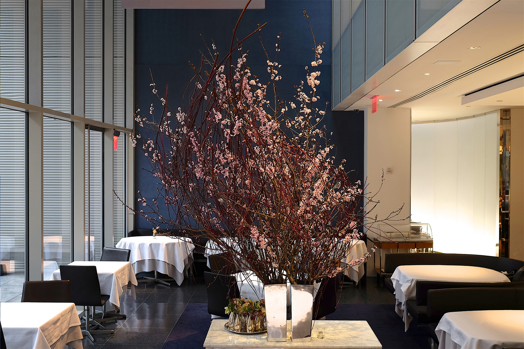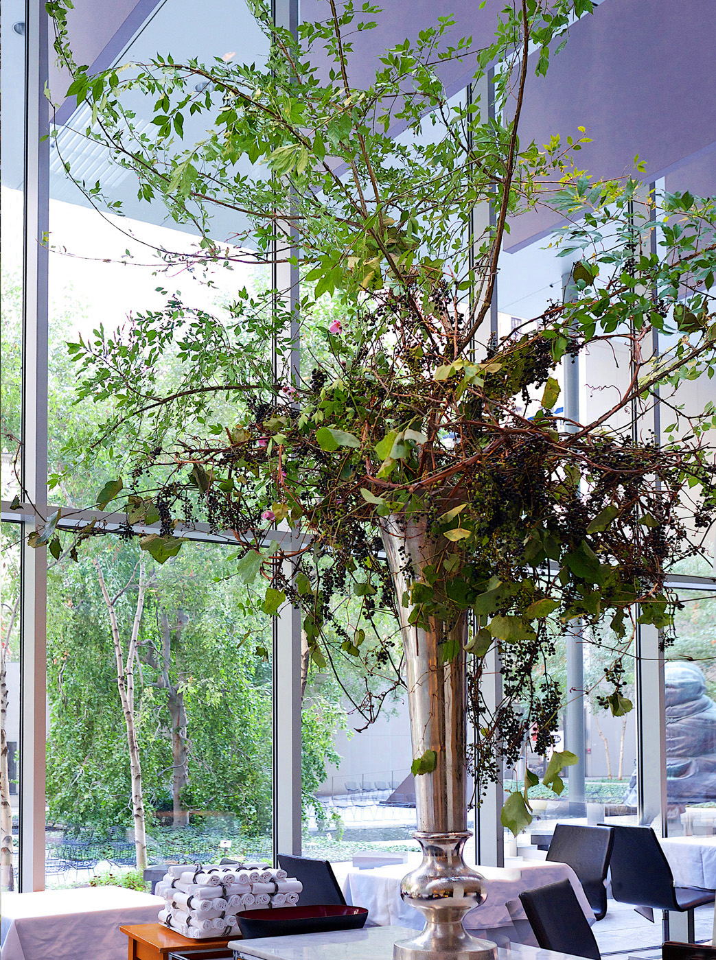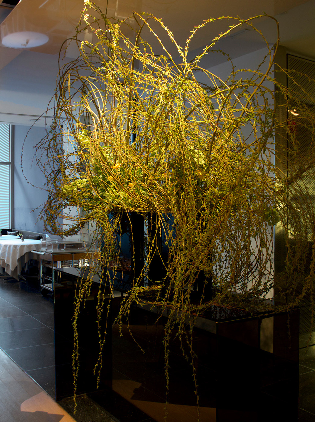 We conceived a weekly installation at The Modern, the two-Michelin starred restaurant at MoMA headed by chef Abram Bissell. The design inverts the landscape into these modernist spaces, our hands channeling wind and weather acting upon the forest and field. We contrive expressions of the wild outdoors, following the forms of branches, grasses and vines where they lead us, and finally populating them with birds, hares and reptiles in the form of flowers. These sculptural pieces are designed in direct conversation with the sculpture garden outside.