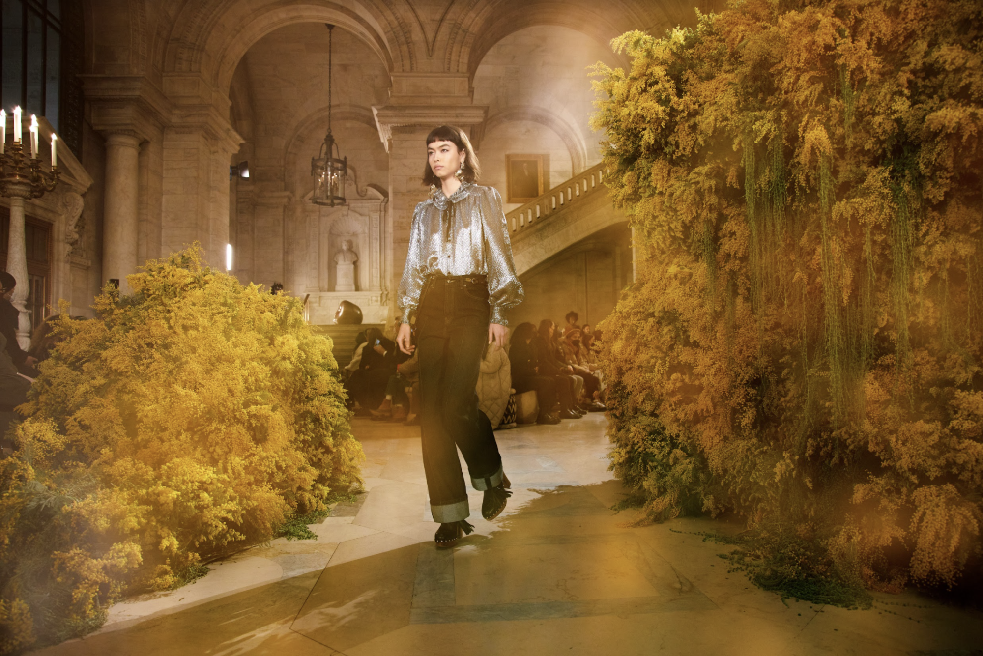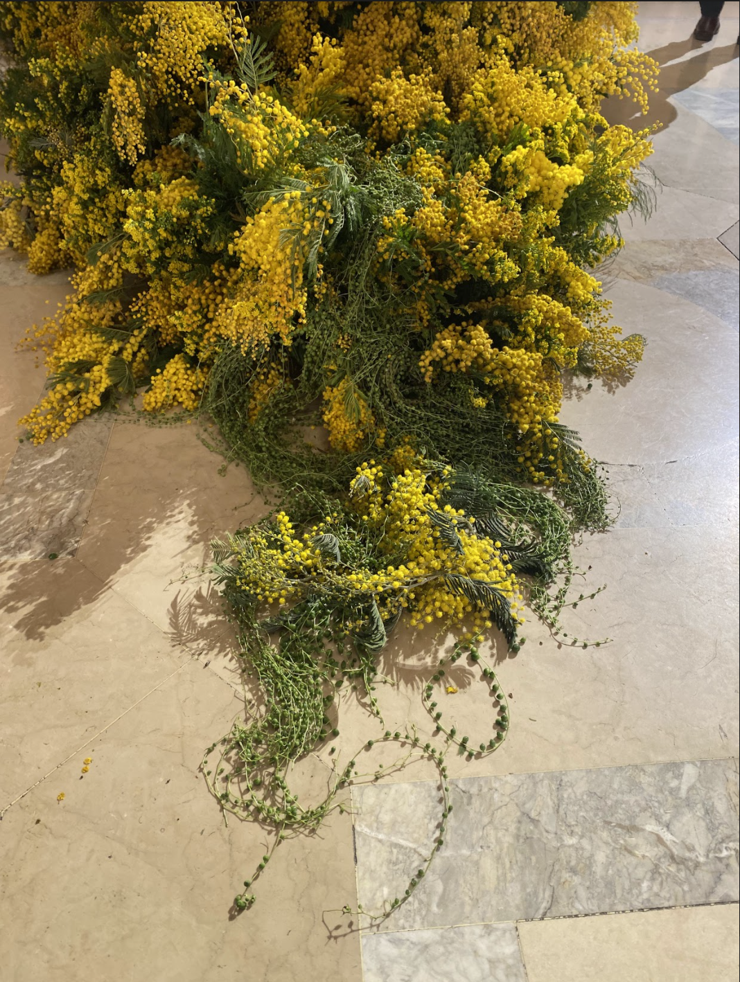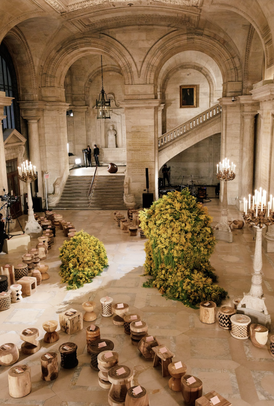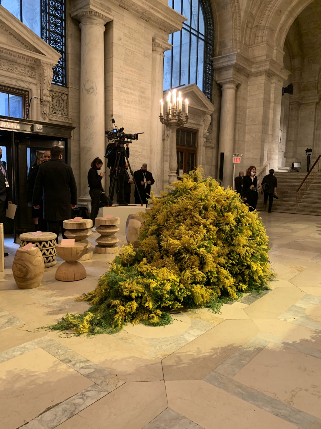 Our set for Ulla Johnson’s runway at the New York Public Library was composed of two monoliths. The largest was a massive form made from thousands of mimosa puffballs, that twisted in on itself, forming crevasses and tunnels, some partly hidden by waterfalls of string-of-pearls.  It’s smaller, slug-shaped companion ended in curling rivulets.  The fragrance of the mimosa (Acacia dealbata) filled the hall.