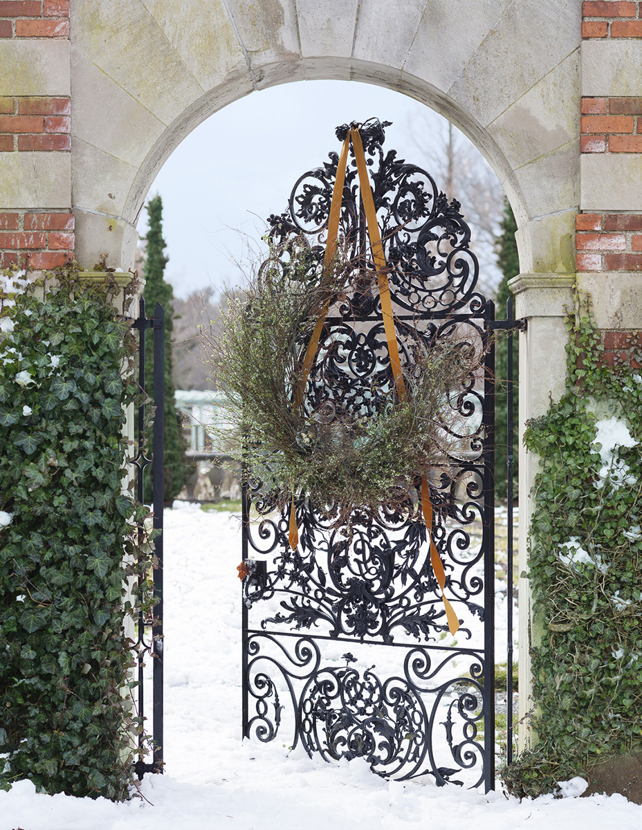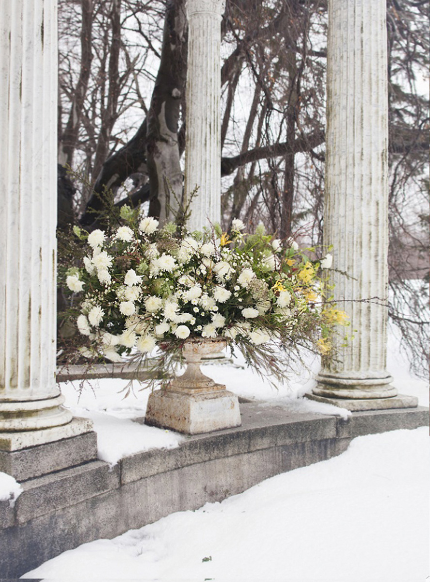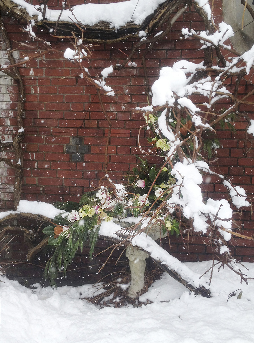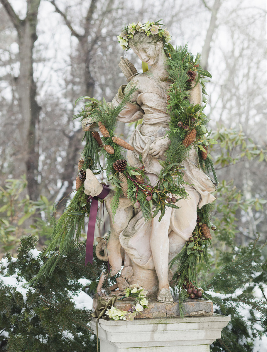 A blizzard engineers some fantastical arrangements. Some fragile blooms are slowly buried in drifts, while in other sheltered spots, the designs themselves mimic the falling snow. Our approach to Holiday design always emphasizes the raw beauty of the natural world, channeling the pagan spirits of ancient forests and tundra.