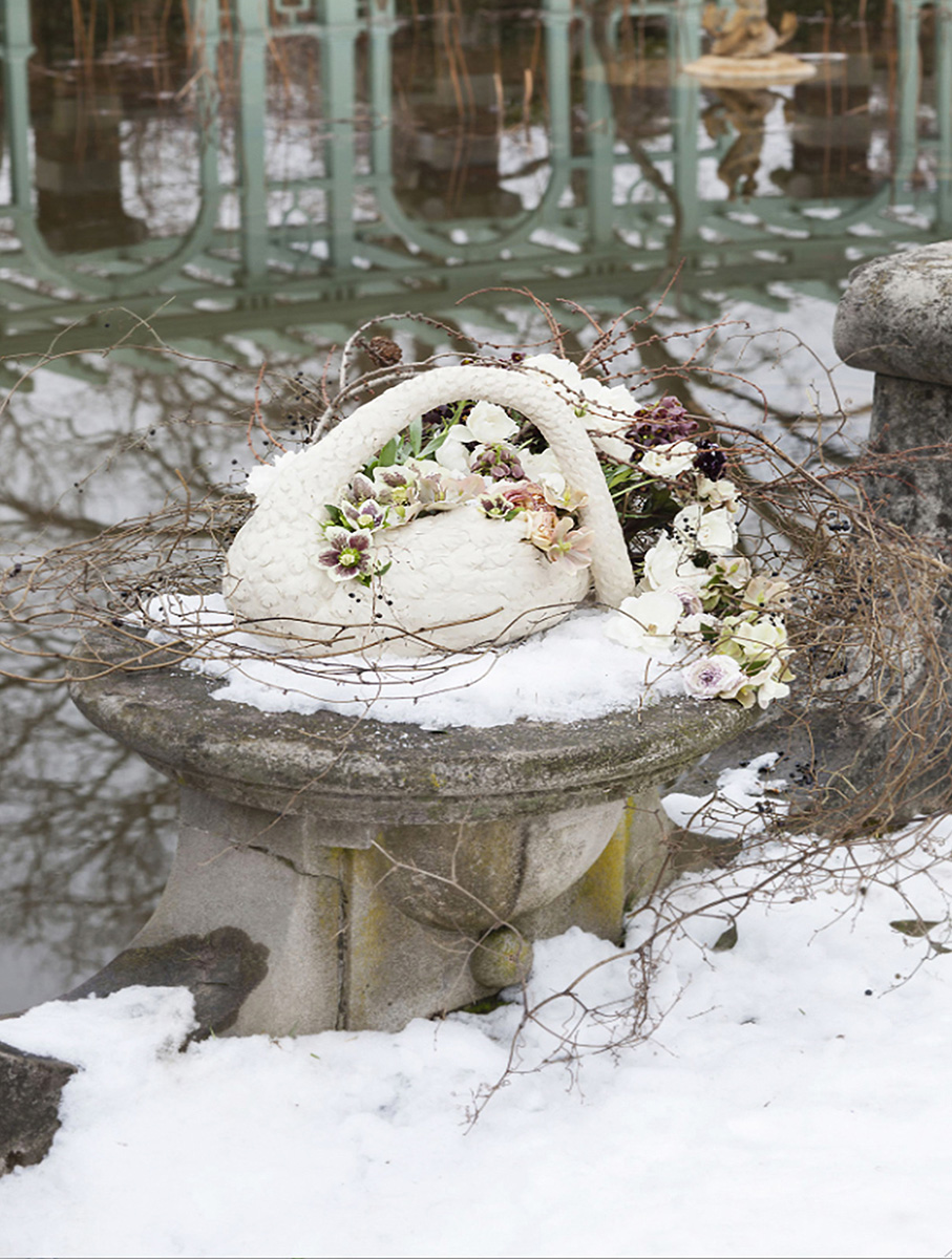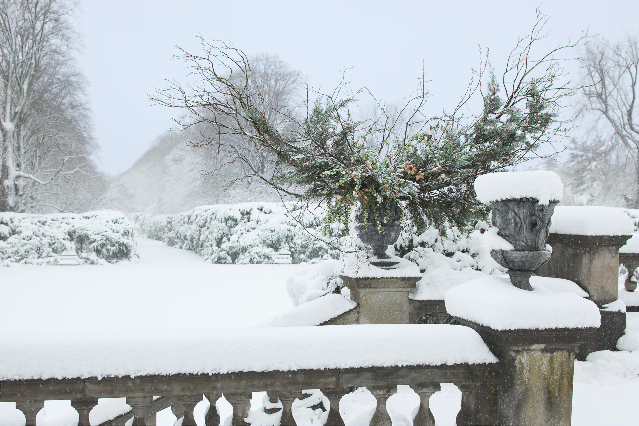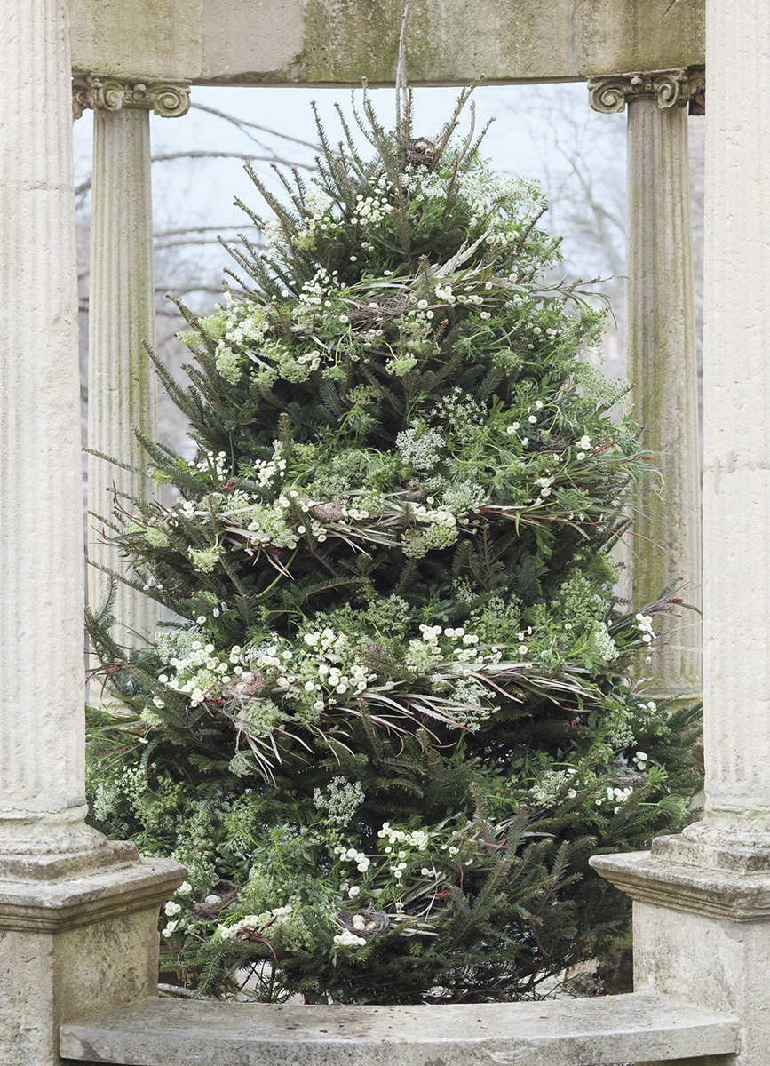 A blizzard engineers some fantastical arrangements. Some fragile blooms are slowly buried in drifts, while in other sheltered spots, the designs themselves mimic the falling snow. Our approach to Holiday design always emphasizes the raw beauty of the natural world, channeling the pagan spirits of ancient forests and tundra.